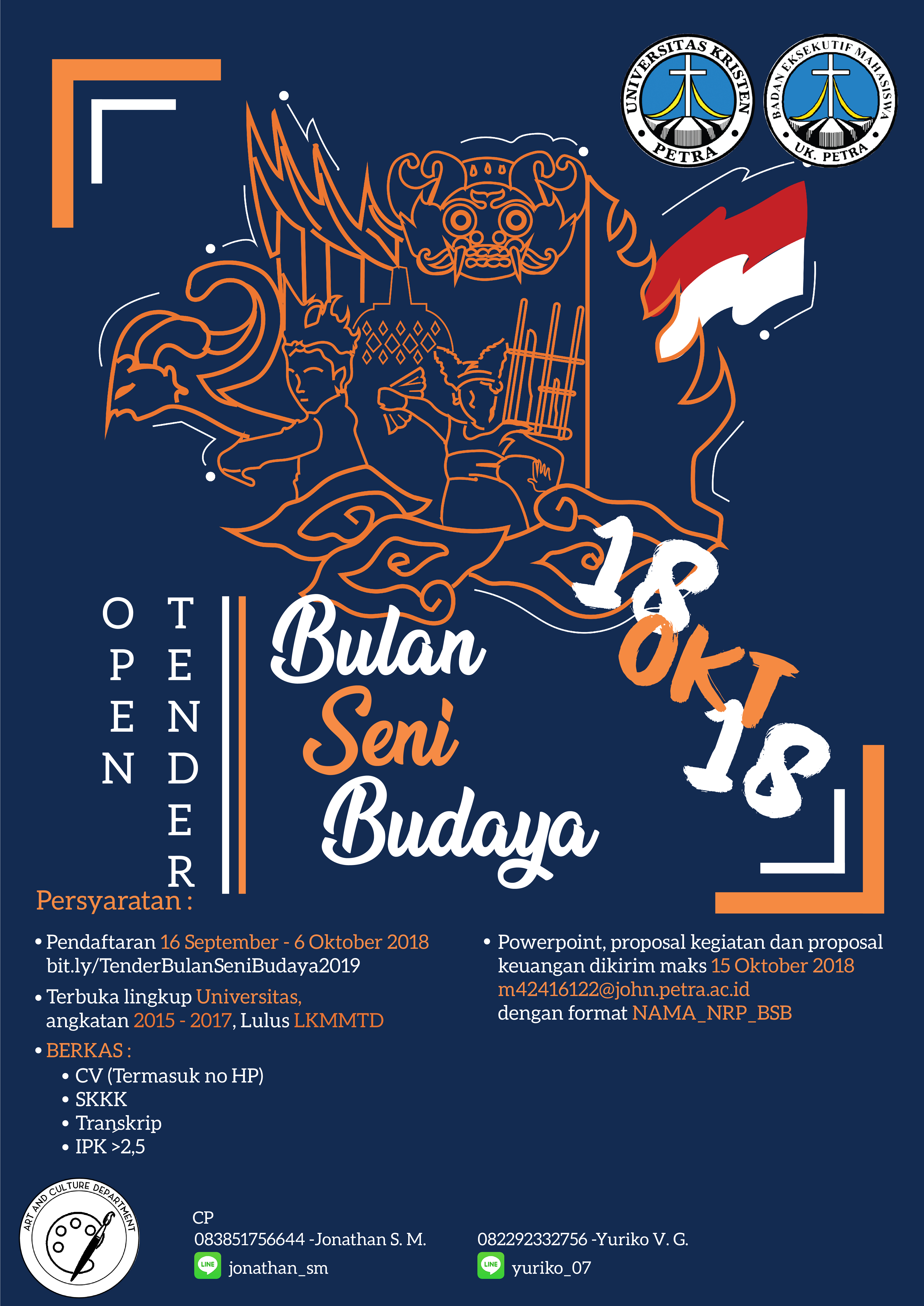 Badan Eksekutif Mahasiswa Universitas Kristen Petra Surabaya membuka kesempatan bagi mahasiswa UK Petra untuk menjadi panitia dalam rangka Bulan Seni Budaya 2019. Pendaftaran dibuka pada 16 September - 6 Oktober 2018.
