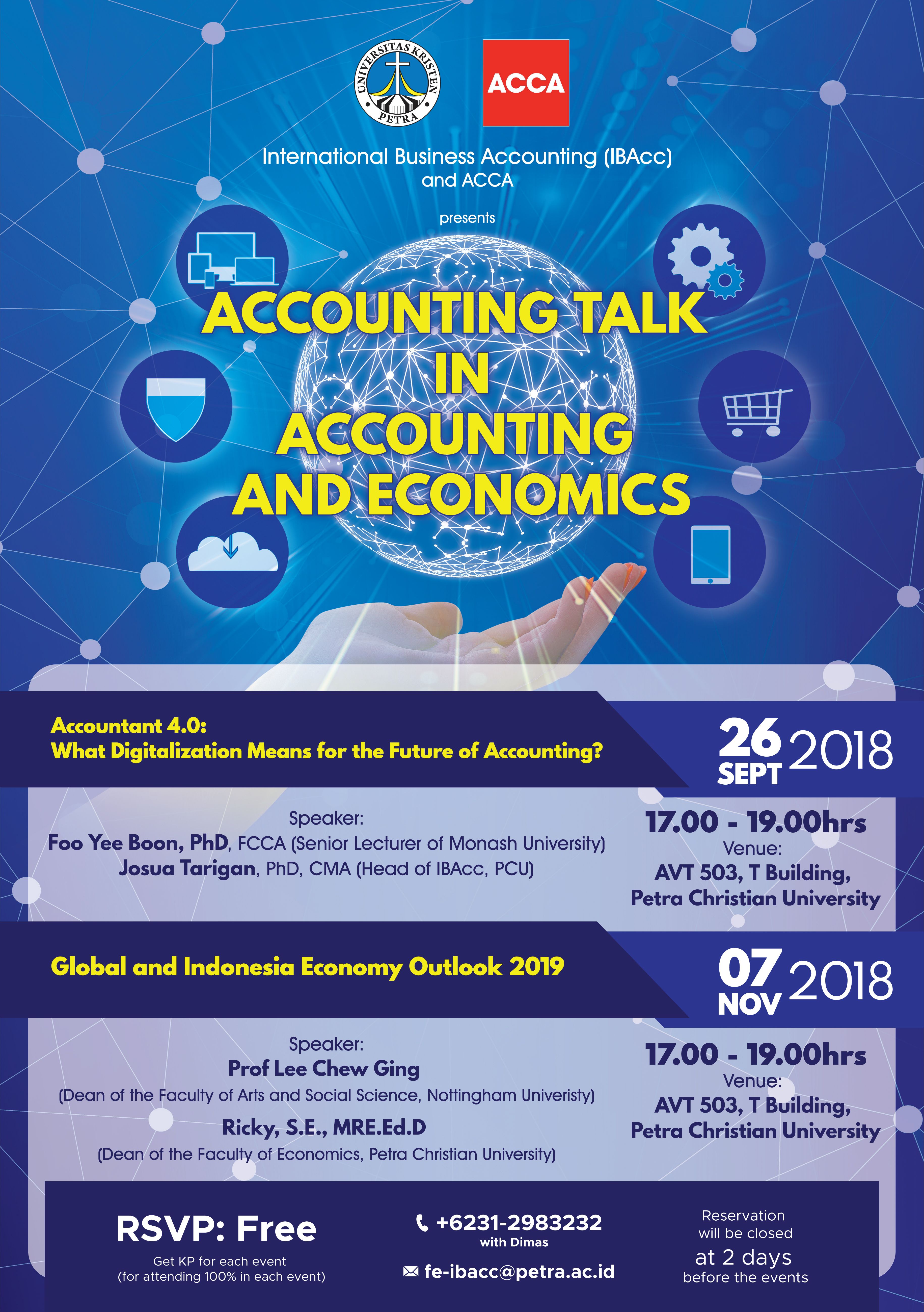 Program International Business Accounting Universitas Kristen Petra Surabaya pada tanggal 26 September 2018 dan 07 November 2018 mengadakan acara Accounting Talk. Bertempat di AV.T.503 Universitas Kristen Petra Surabaya. Pada tanggal 26 September 2018 dengan mengangkat tema "Accountant 4.0" what digitalization mean for the future of accounting?" dengan narasumber Foo Yee Boon dan Josua Tarigan. Sedangkan pada tanggal 07 November 2018 mengangkat tema "Global and Indonesia economy outlook 2019 dengan narasumber Lee Chew Ging dan Ricky