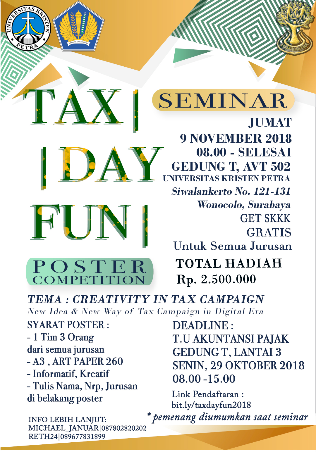 Program Studi Akuntansi Pajak Universitas Kristen Petra mengadakan acara lomba poster tentang pajak yang diselenggarakan pada tanggal 29 Oktober 2018, denga tema "Creativity in tax campaign". Selain itu juga diselenggarakan seminar tentang pajak yang akan diselenggarakan pada 09 November 2018. Bertempat di gedung AV.T.502.