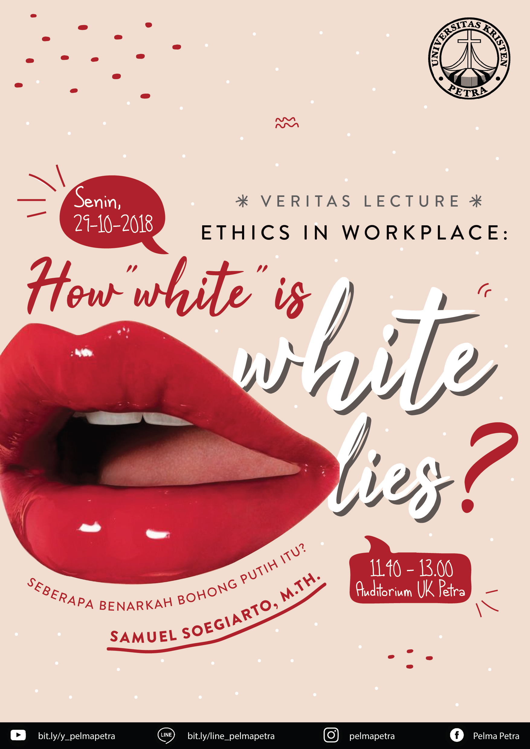 Universitas Kristen Petra melalui pusat kerohanian mengundang seluruh civitas akademika universitas kristen petra untuk turut hadir dalam kebaktian universitas setiap hari Senin. Pada tanggal 29 Oktober 2018 bertempat di Auditorium UK Petra, kebaktian ini mengangkat tema "How white is white lies? (seberapa benarkah bohong putih itu?)" dengan menghadirkan bapak Samuel Soegiarto, M.Th. sebagai pengkhotbah.