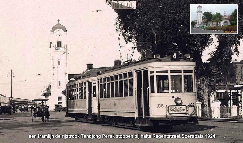 Kondisi jalan Kebonrojo - Indrapura Surabaya 1924 dengan tram dan dokar melintas. Foto insert masa kini