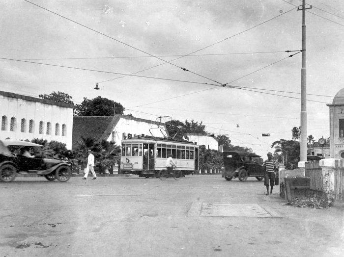 Tram listrik melintas di depan Hotel Simpang diperkirakan 1900 - 1940