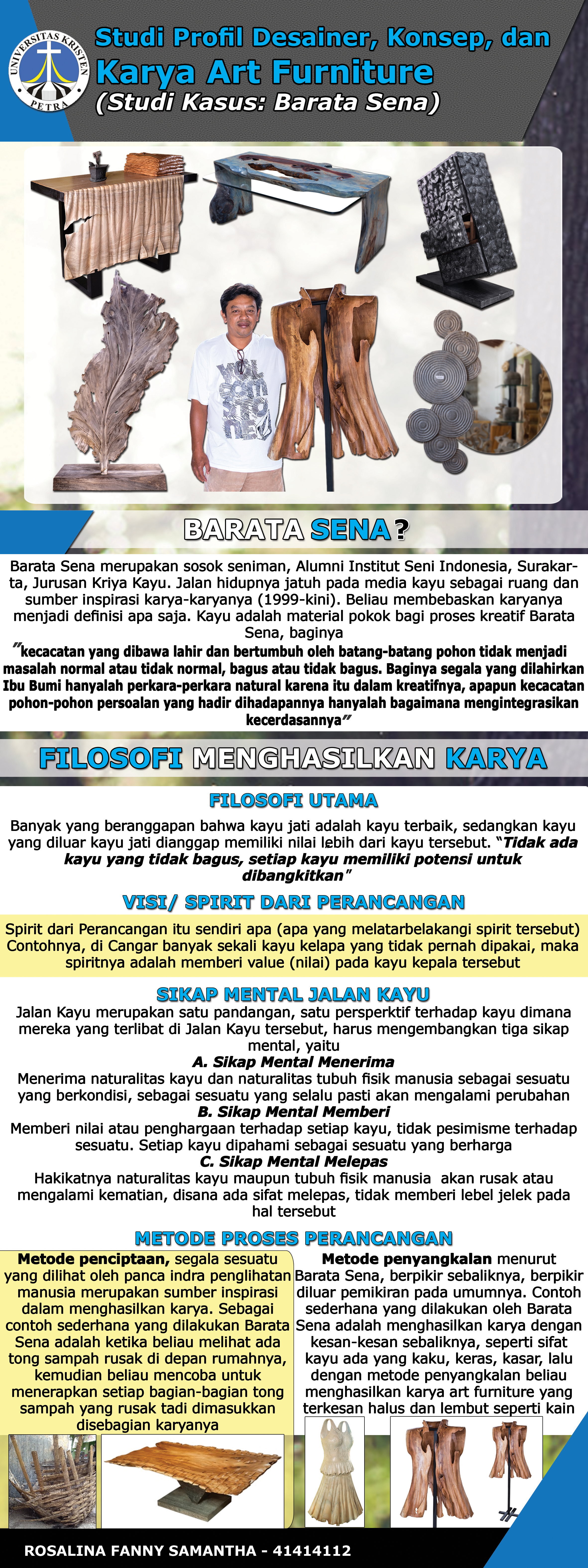 kreatifnya,apapun kecacatan pohon-pohon, persoalan yang hadir dihadapannya hanyalah bagaimana mengintegrasikan kecerdasannya ke dalam kerjasamanya dengan batang-batang pohon tersebut. Permasalahan yang dirumuskan adalah bagaimana profil lengkap Barata Sena, filosofi Barata Sena dalam menghasilkan karya art furniture, dan bagaimana proses perwujudan karya art furniture Barata Sena. Penulis menggunakan metode kualitatif deskriptif, yaitu dengan wawancara mendalam dengan pelaku, dan dokumentasi terkait data lapangan seperti foto-foto karya, hasil wawancara Barata Sena dengan Bulan Soerbadjati, dan sumber dari internet mengenai Barata Sena. Metode desain yang digunakan Barata Sena