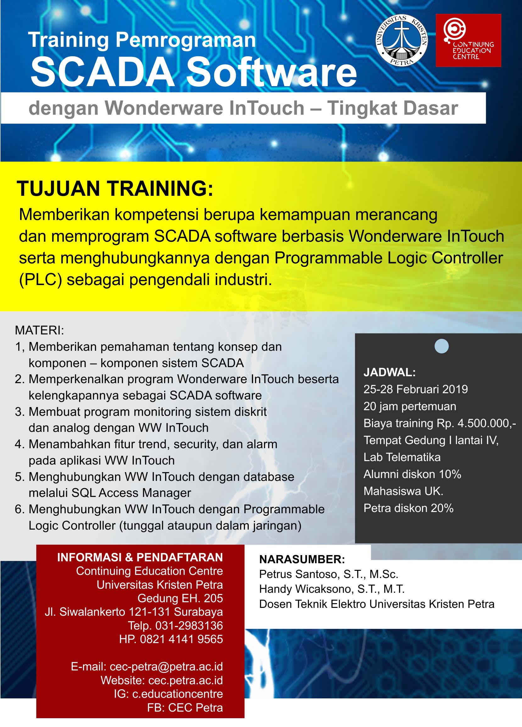 Program Pendidikan Profesional Berkelanjutan Universitas Kristen Petra mengadakan training software Scada. Jadwal training ini pada 25-28 Februari 2019 bertempat di gedung I lantai IV kampus UK Petra. Dengan narasumber bapak Petrus Santoso dan bapak Handy Wicaksono, dan biaya training sebesar 4.500.000 Rupiah.