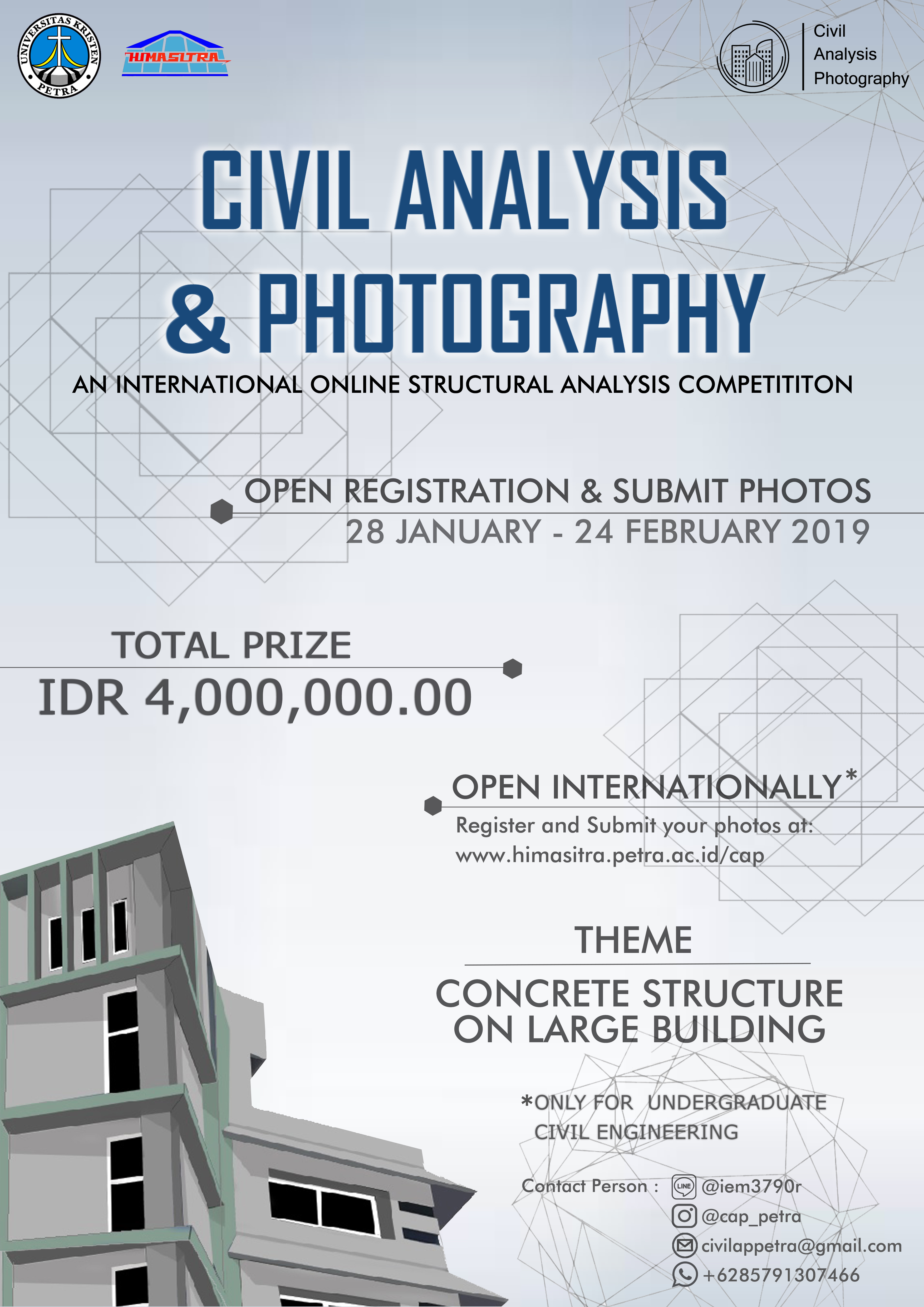 Program Studi Teknik Sipil UK Petra mengadakan lomba fotografi tentang analisa struktur. pendaftaran dan penyerahan foto dapat dilakukan pada tanggal 28 Januari - 24 Februari 2019. Acara ini memperebutkan total hadiah 4.000.000 Rupiah.