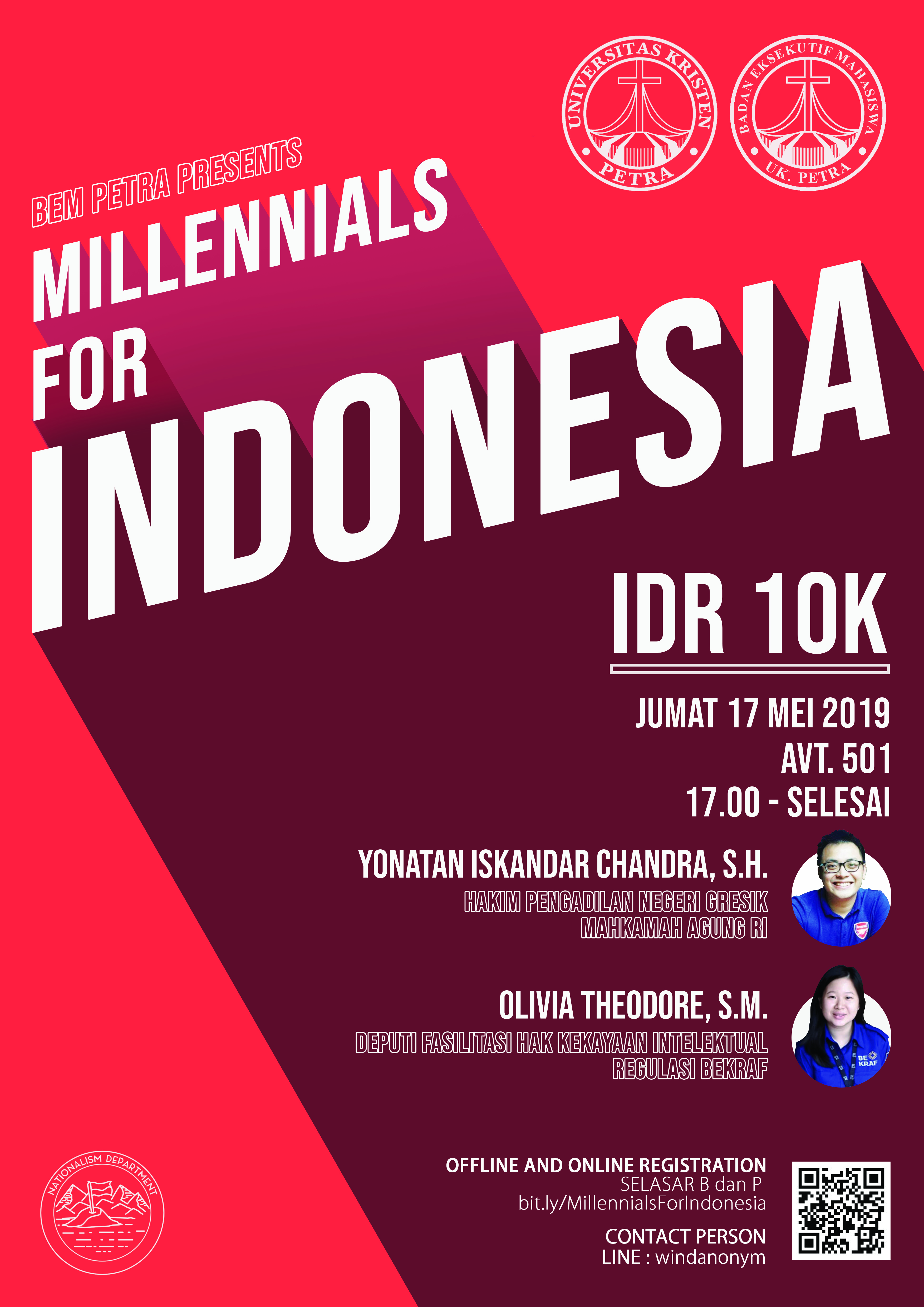 Badan Eksekutif Mahasiswa Universitas Kristen Petra Surabaya mengadakan seminar dengan tema "Millennials for Indonesia". Acara ini diselenggarakan pada Jumat, 17 Mei 2019 bertempat di gedung AV.T.501. Dengan menghadirkan Yonatan Iskandar Chandra, dan Olivia Theodore sebagai narasumber.