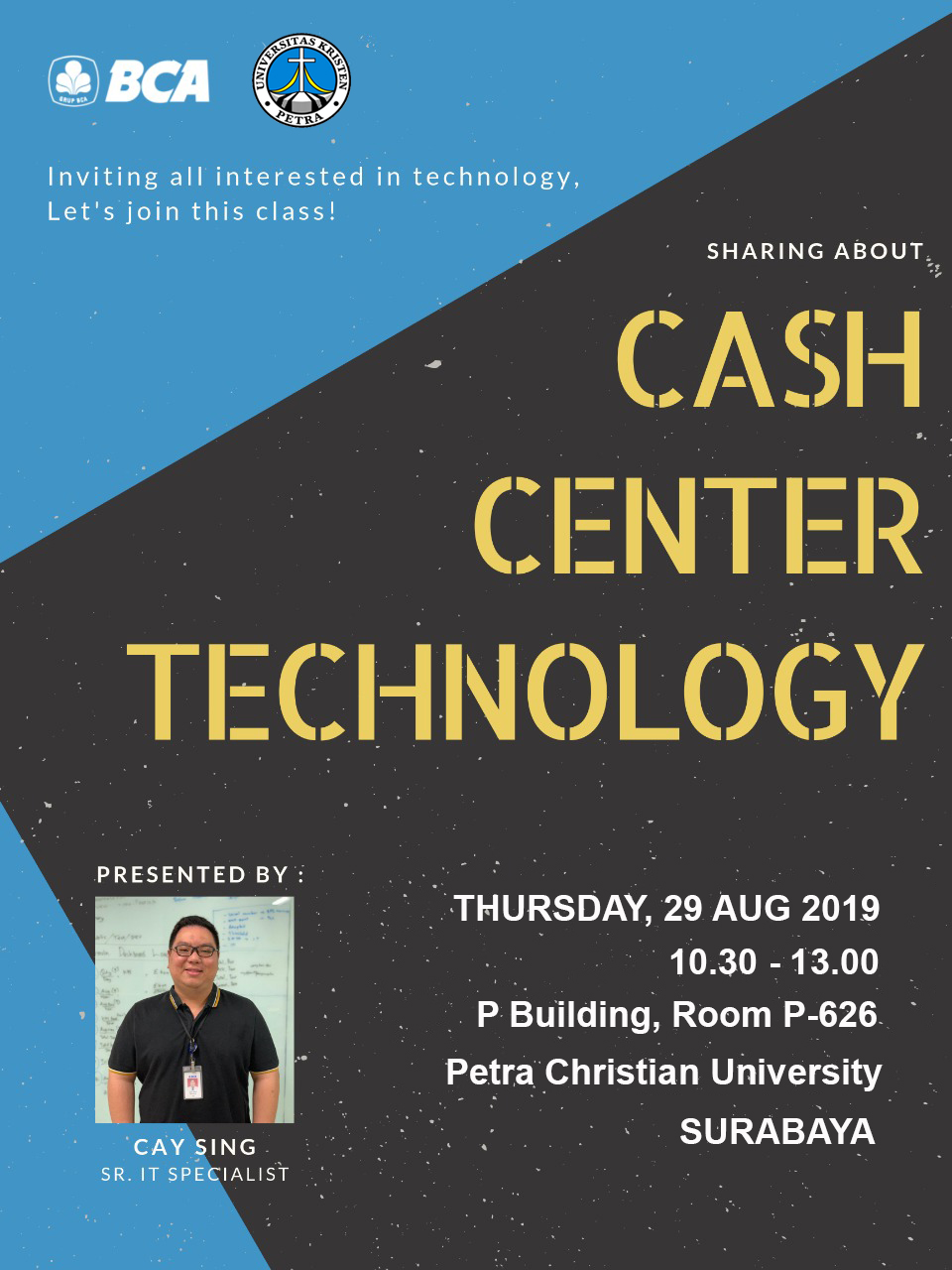 Program Studi Teknik Informatika Universitas Kristen Petra Surabaya pada tanggal 29 Agustus 2019 bertempat di gedung P.626. mengadakan kuliah umum dengan tema "Cash Center Technology". Dengan narasumber Cay Sing.