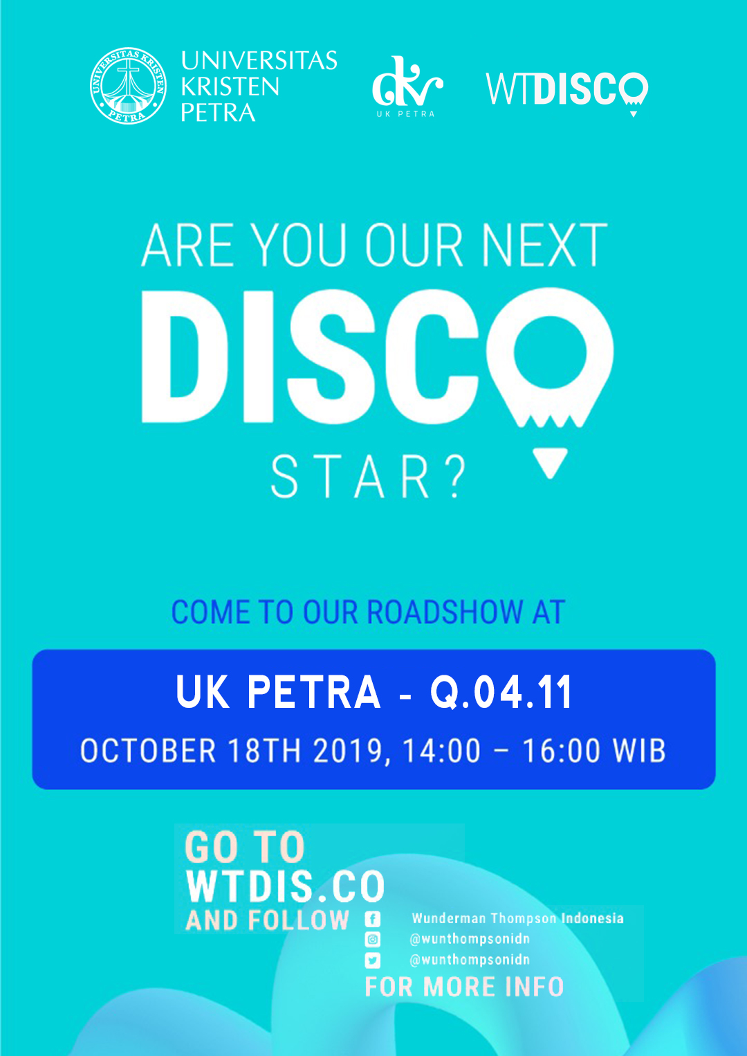 Pada tanggal 18 Oktober 2019, jam 14.00 - 16.00 bertempat di gedung Q.04.11, Desain komunikasi Visual Universitas Kristen Petra kedatangan tim dari WTDISCO. Acara ini bertajuk roadshow WTDISCO to campus.