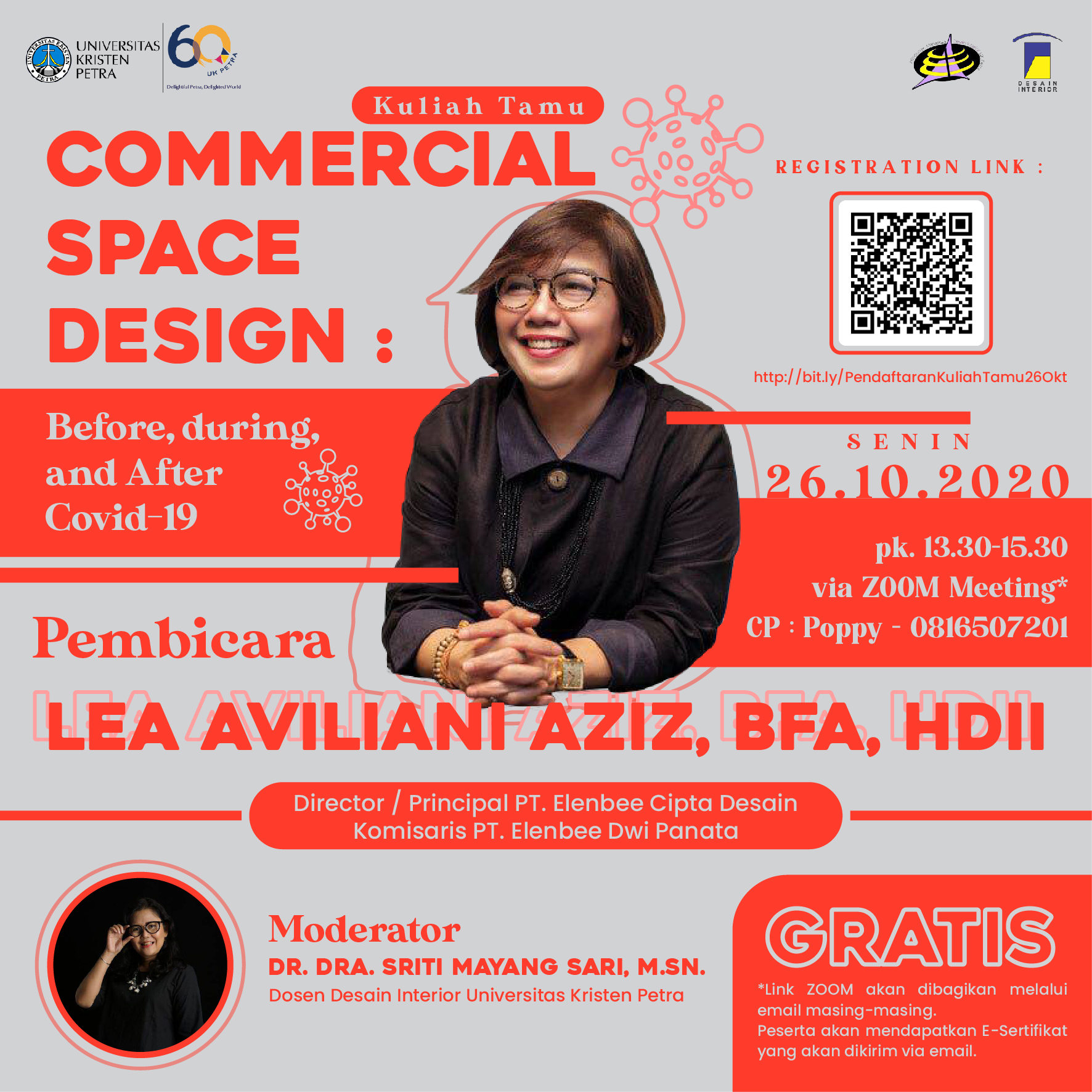 Program Studi Desain Interior Universitas Kristen Petra Surabaya pada tanggal 26 Oktober 2020, mengadakan kuliah tamu dengan topik "Commercial space design: before, during, and after Covid-19". Dengan cara online kuliah tamu ini menghadirkan Lea Aviliani aziz, BFA, HDII, sebagai pembicara. Dan sebagai moderator adalah Dr. Dra. Sriti Mayangsari M.Sn.