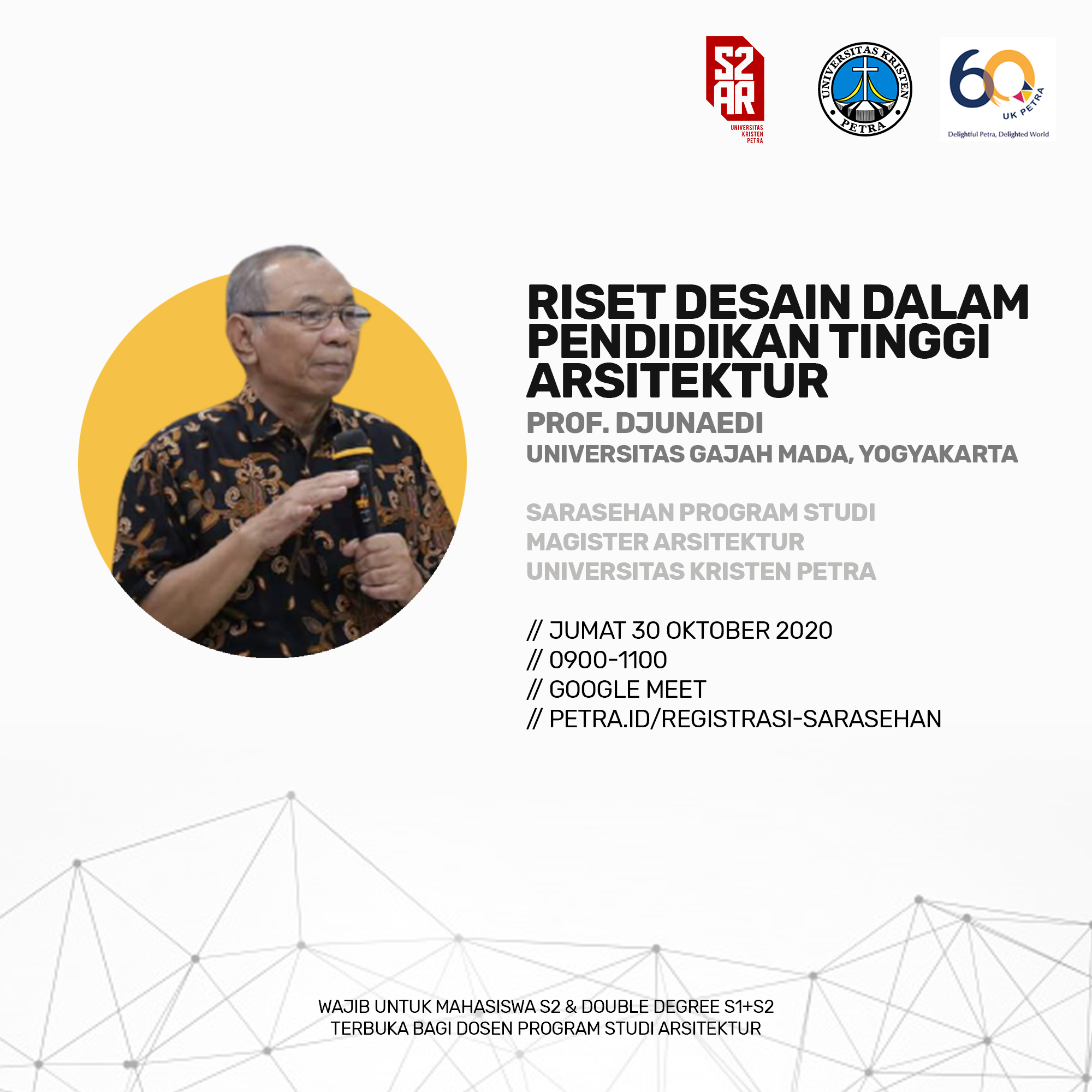 Magister Arsitektur Universitas Kristen Petra Surabaya, mengadakan sarasehan dengan topik "Riset – desain dalam pendidikan tinggi Arsitektur". Kegiatan ini diadakan pada tanggal 30 Oktober 2020 secara online, dengan narasumber Prof. Djuanedi dari UGM Yogyakarta.