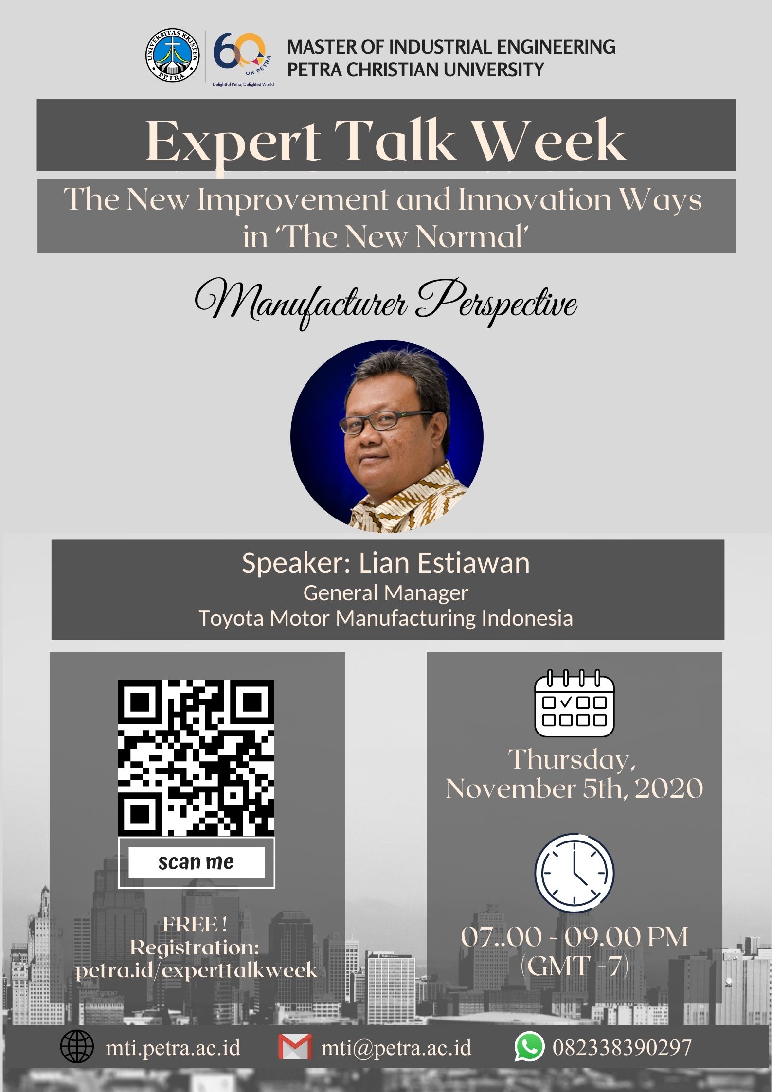 Magister Teknik Industri UK Petra Surabaya, mengadakan acara Expert talk week "Manufacturer Perspective". Acara ini diadakan pada tanggal 5 November 2020 jam 19.00 - 21.00 WIB. Dengan narasumber bapak Lian Estiawan dari Toyota Indonesia. Acara ini berlangsung secara online.