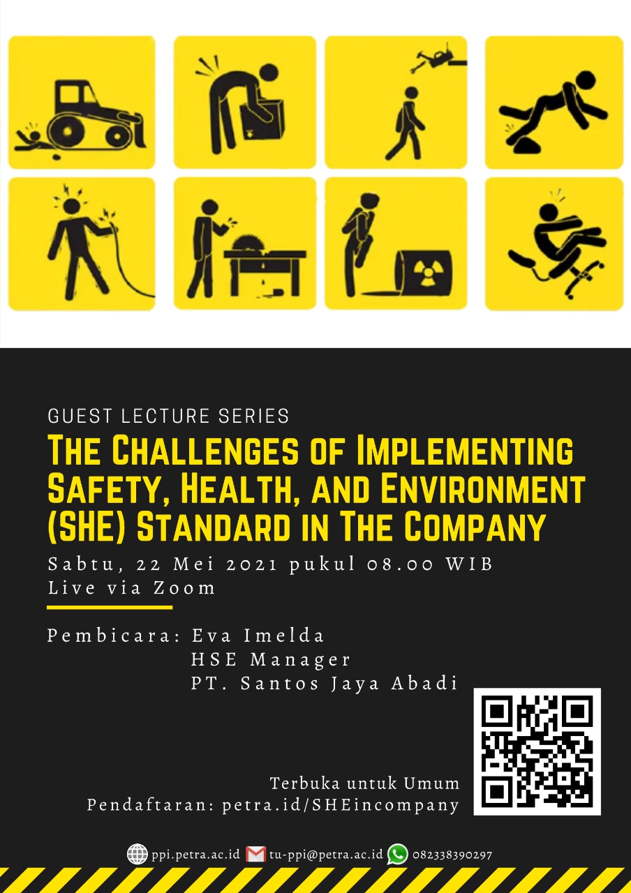 Fakultas Teknologi Industri Universitas Kristen Petra Surabaya, pada tanggal 22 Mei 2021 pukul 08.00 WIB mengadakan acara guest lecture series dengan topik "The challenges of implementing safety, health, and environment (SHE) standard in the company". Dengan narasumber Eva Imelda dari PT Santos Jaya Abadi, dilaksanakan secara online memalui aplikasi Zoom.