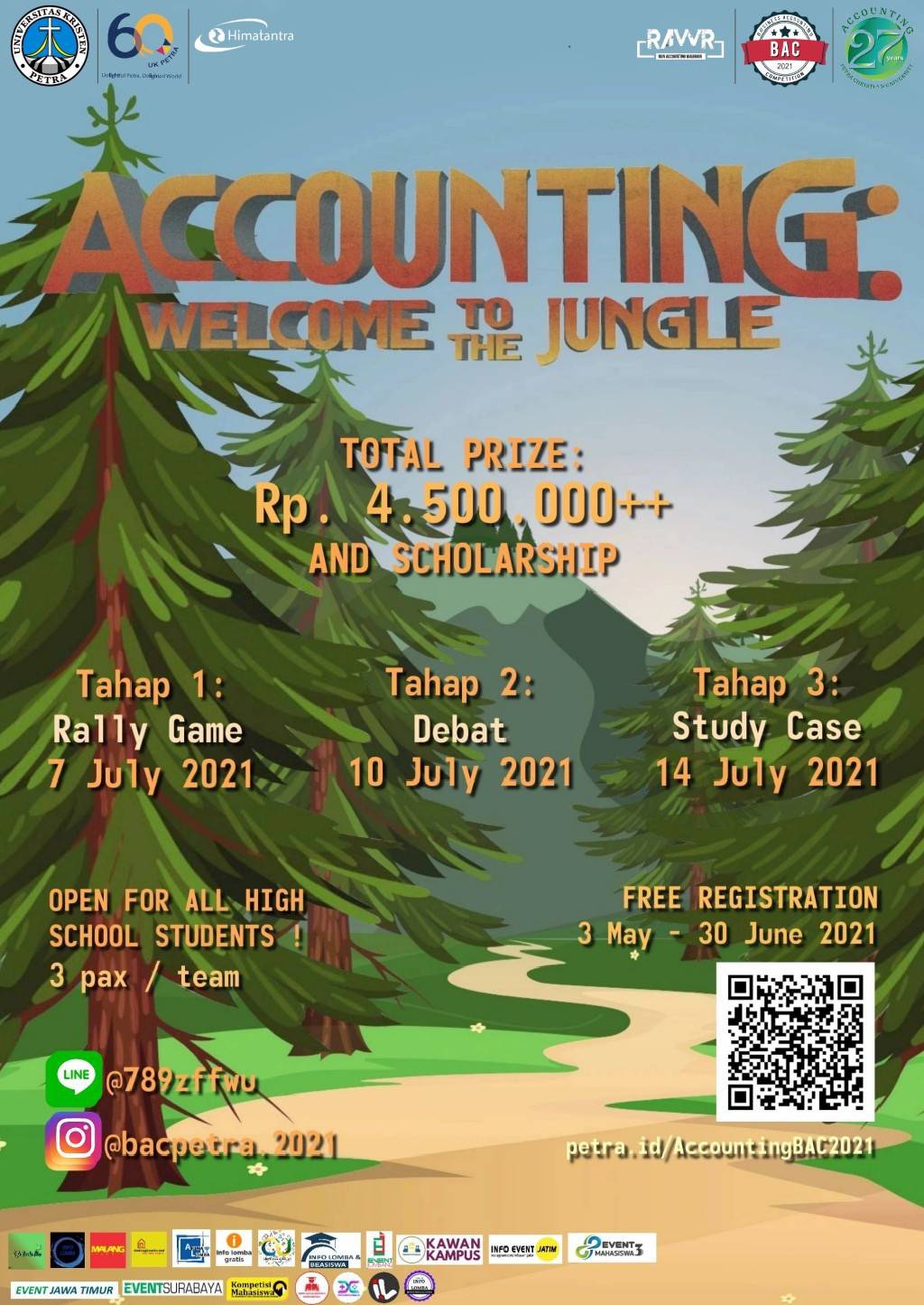Program Akuntansi Bisnis Universitas Kristen Petra Surabaya pada tanggal 7-14 Juli 2021 mengadakan kompetisi tentang akuntansi bisnis. Untuk pendaftaran dibuka pada tanggal 3 Mei - 30 Juni 2021. Info selengkapnya bisa dilihat di petra.id/AccountingBAC2021