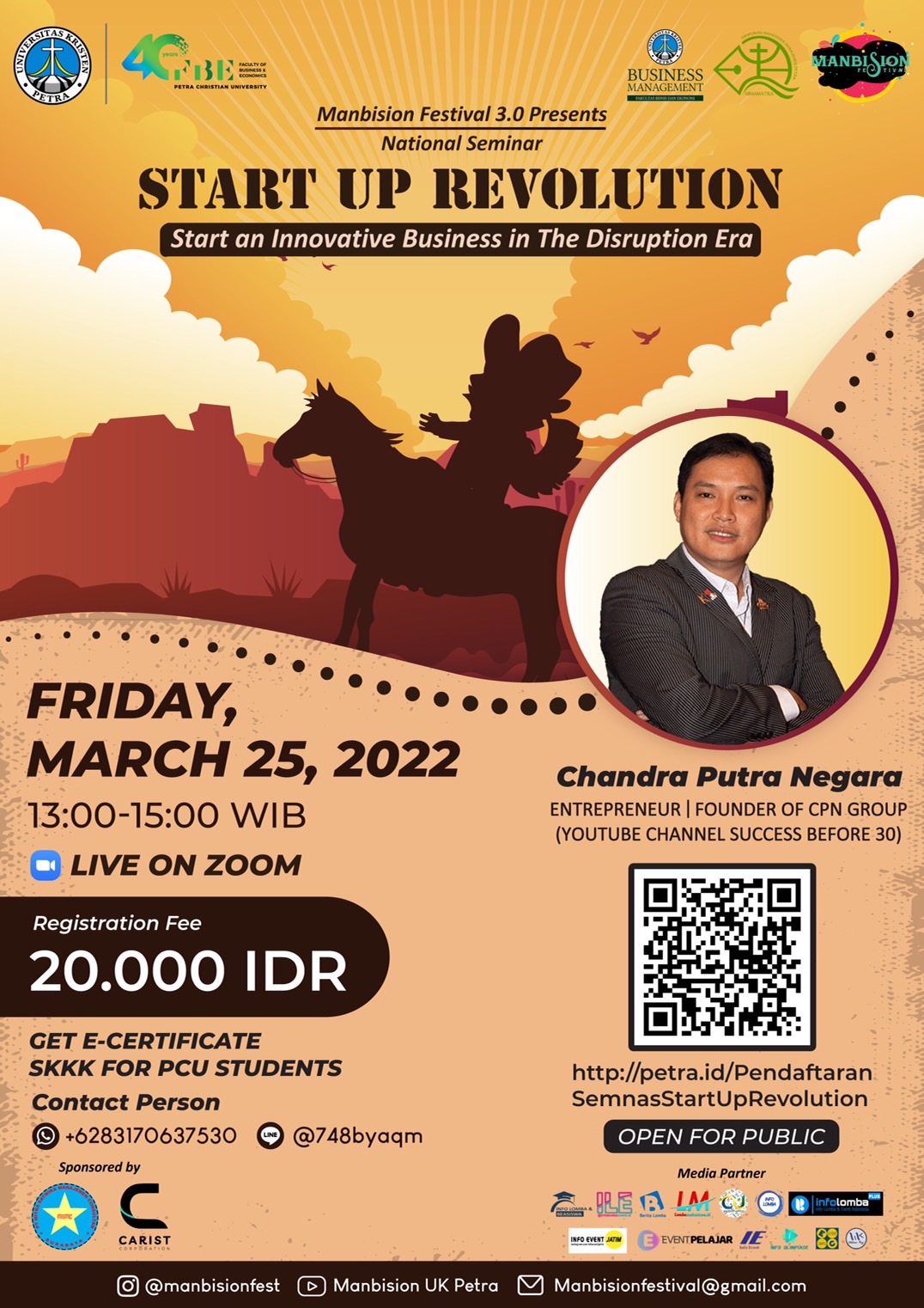 Bagi kalian yang masih ingin belajar tentang bisnis dan Start-up, kali ini Manfest 3.0 akan menghadirkan special speaker, Chandra Putra Negara, seorang, Business Motivator, Founder of Success Before 30, dan Founder of CPN group yang tentunya sangat berpengalaman dalam bidang bisnis