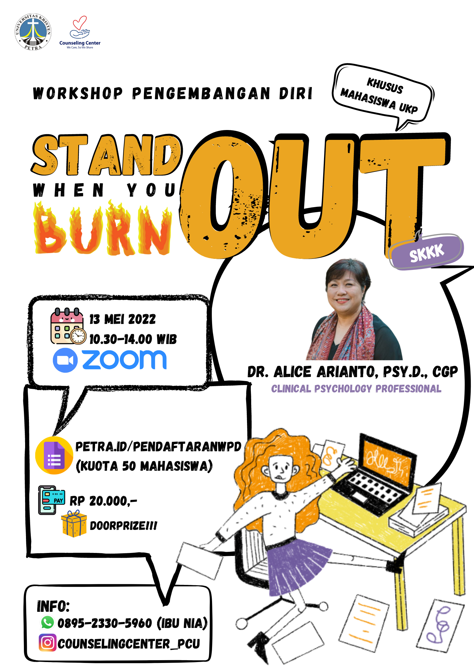 Workshop pengembangan diri: stand out when you burn out akan diadakan oleh Pusat Konseling dan Pengembangan Pribadi UK Peytra Surabaya, pada tanggal 13 Mei 2022 jam 10.30 - 14.00 WIB. Dengan narasumber Dr. Alice Arianto. Kegiatan ini berlangsung secara online melalui aplikasi Zoom.