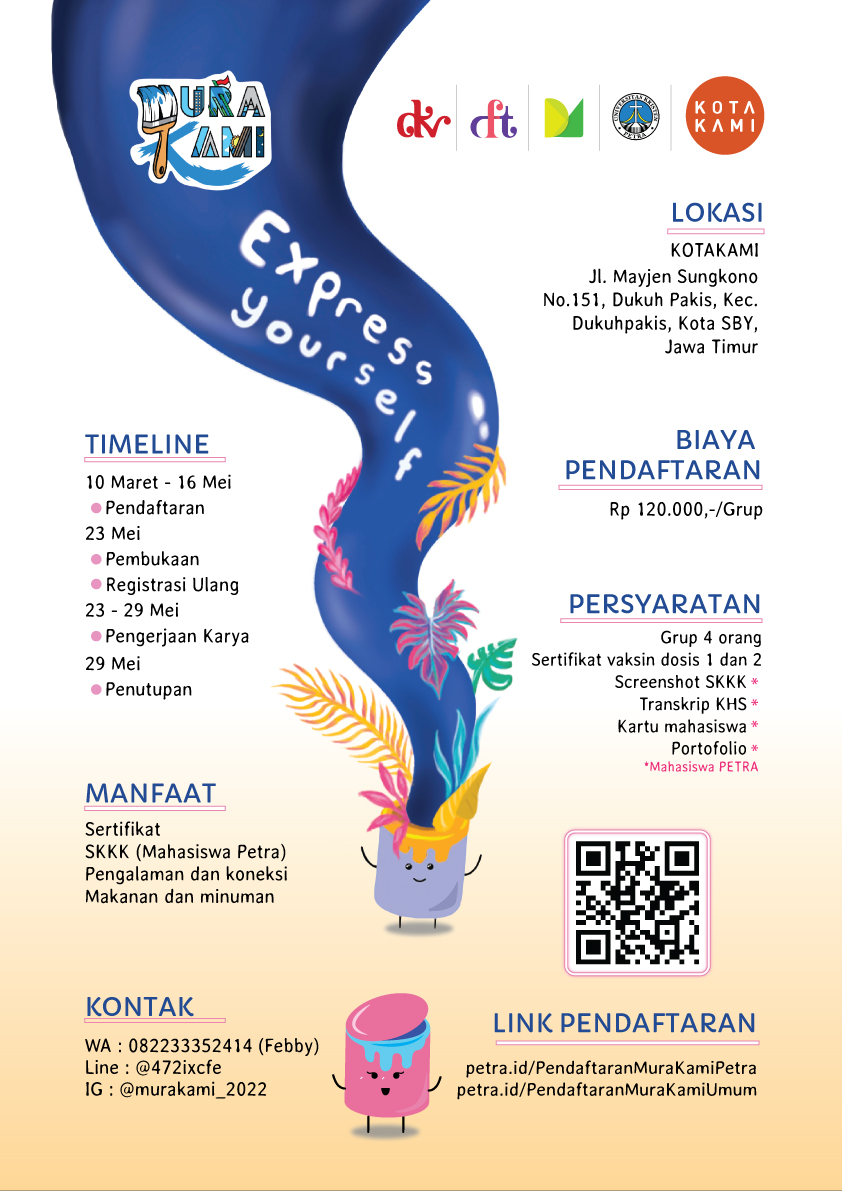 MURA KAMI adalah sebuah acara mural yang diadakan oleh program studi DKV Universitas Kristen Petra bersama Kota Kami. Acara akan diadakan di jalan Mayjen Sungkono No.151 Surabaya pada tanggal 23 - 29 Mei 2022. Untuk info pendaftaran bisa dilihat di petra.id/PendaftranMuraKamiPetra
