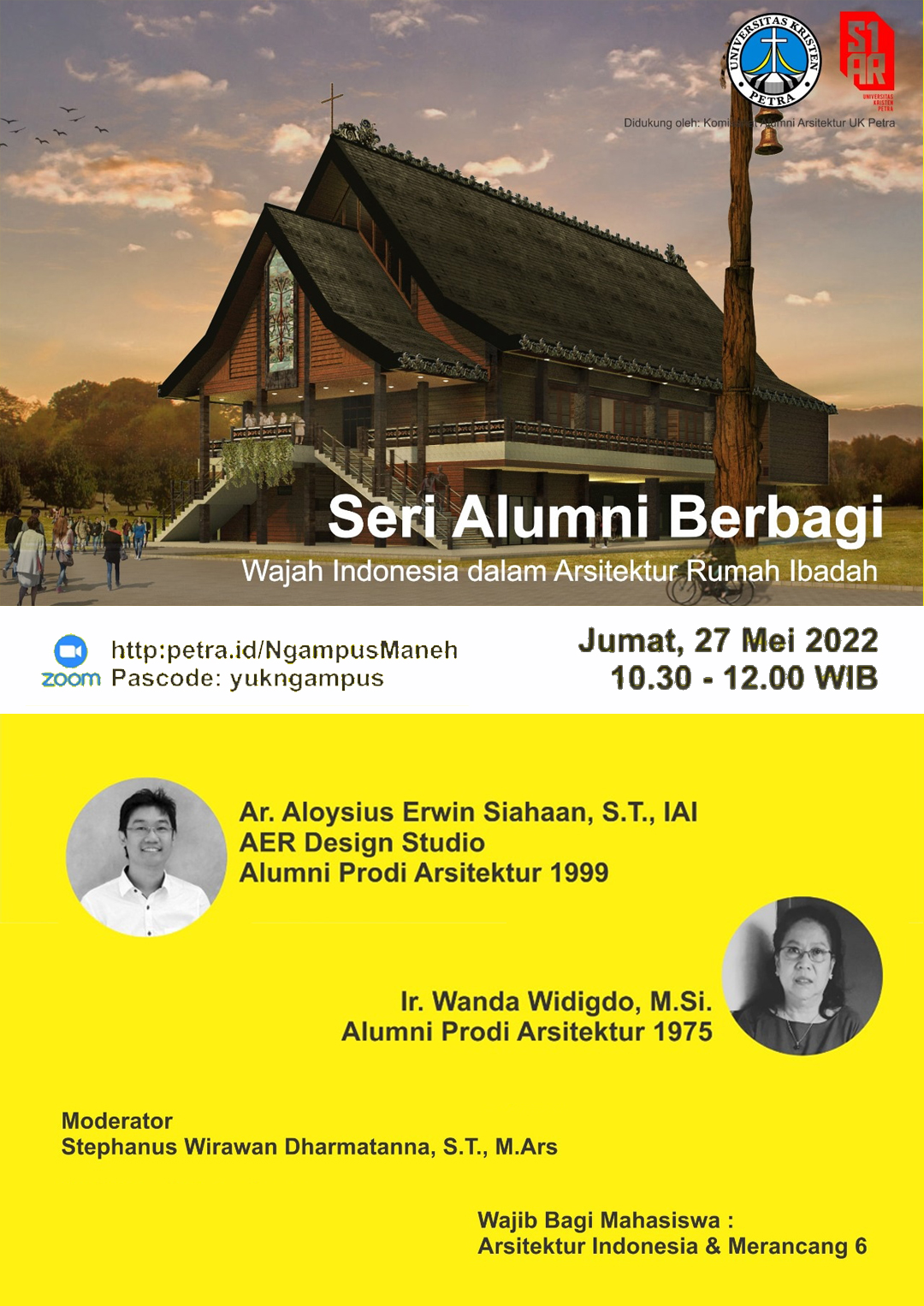Seri alumni berbagi: wajah Indonesia dalam arsitektur rumah ibadah, merupakan acara yang diselenggarakan oleh Program Studi Teknik Arsitektur UK Petra. Diadakan pada Jumat, 27 Mei 2022 jam 10.30 - 12.00 WIB dengan narasumber Ar. Aloysius Erwin Siahaan, S.T., IAI. Dengan melalui aplikasi Zoom.
