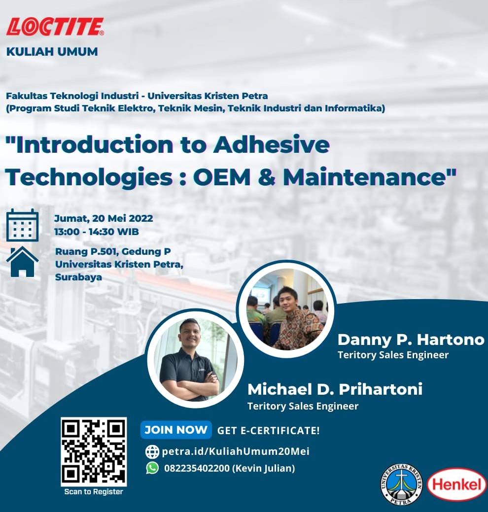 Kuliah umum : "Introduction to adhesive technologies : OEM & maintenance", dilaksanakan oleh Fakultas Teknologi Industri UK Petra, pada Jumat, 20 Mei 2022 jam 13.00 - 14.30 WIB di ruang P.501. Dengan narasumber Danny P. Hartono dan Michael D. Prihartoni