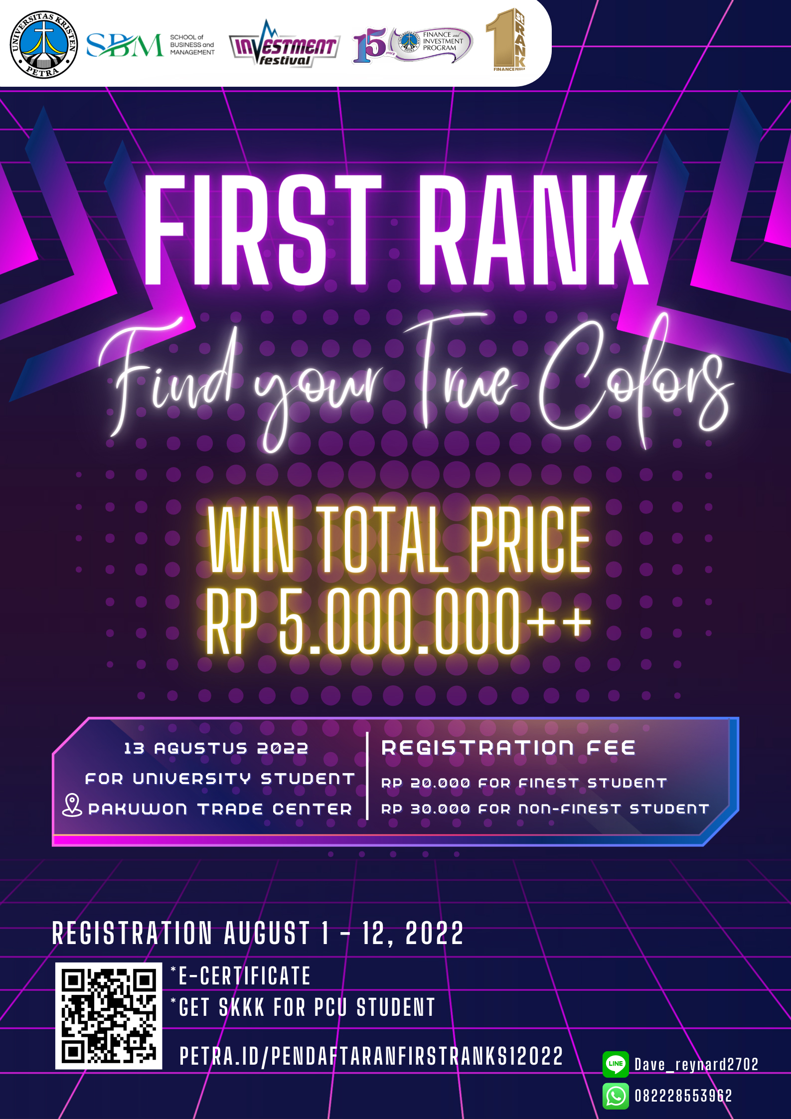 Lomba 1st rank in Finance, akan dilaksanakan oleh Manajemen Keuangan UK Petra pada tanggal 13 Agustus 2022 bertempat di PTC Surabaya. Untuk informasi pendaftaran bisa dilihat di petra.id/pendaftaranfirstranksi2022.