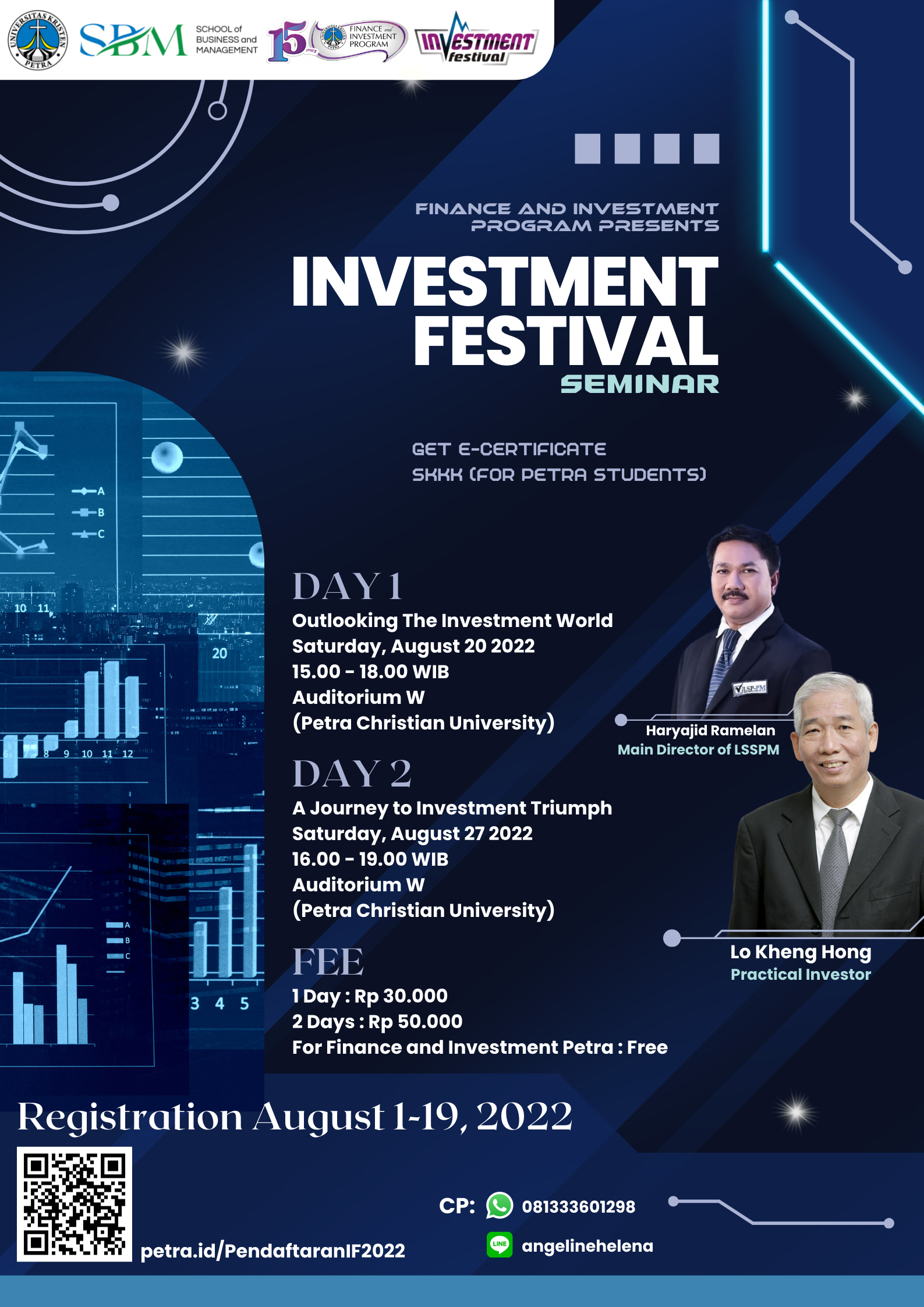 Program Manajemen Keuangan Universitas Kristen Petra Surabaya, pada tanggal 20 dan 27 Agustus 2022, mengadakan acara festival seminar. Acara seminar yang diadakan pada opening ceremony dan awarding night Investment Festival. Untuk info pendaftaran bisa dilihat di http://petra.id/PendaftaranIF2022