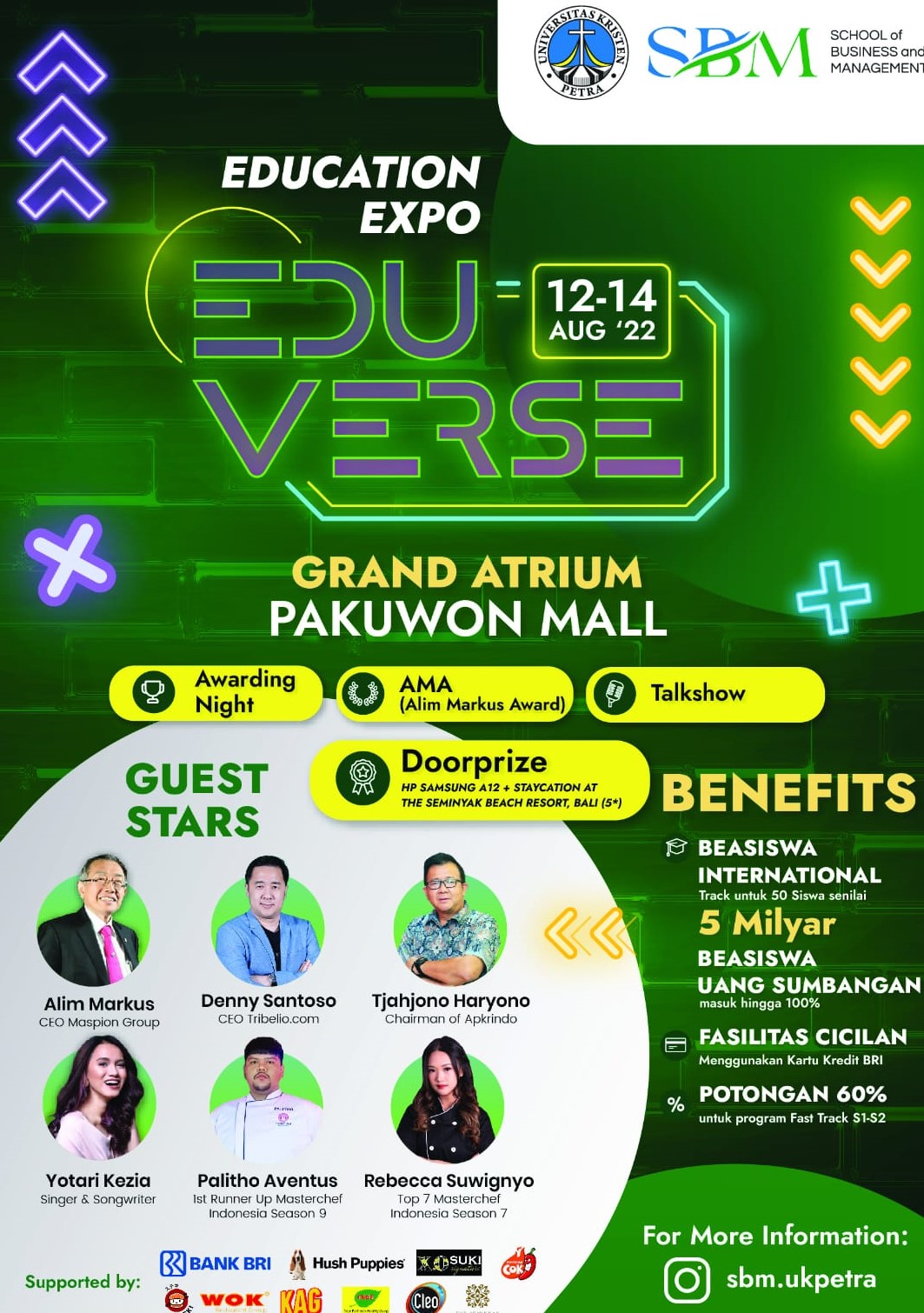 EduVerse merupakan pameran edukasi program-program studi yang bernaung di bawah SBM (School of Business and Management) dimana siswa-siswa SMA yang akan melanjutkan studinya ke jenjang universitas dapat berkonsultasi langsung dengan dosen-dosen dari masing-masing program studi. Selama pameran, akan diadakan pula berbagai performance dari mahasiswa dan alumni SBM. Acara ini dilaksanakan pada tanggal 12-14 Agustus 2022,bertempat di Grand Atrium Pakuwon Mall Surabaya.