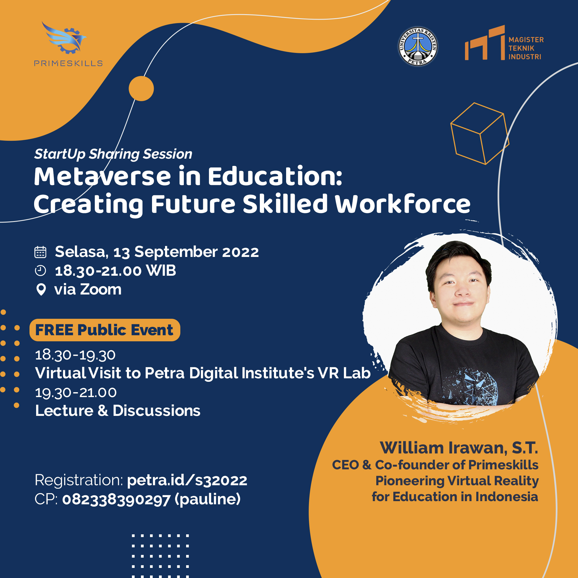StartUp Sharing Session Metaverse in Education: Creating Future Skilled Workforce dengan narasumber William Irawan S.T. Pada tanggal : Selasa, 13 Sep 2022 jam 18.30-21.00 WIB via Zoom