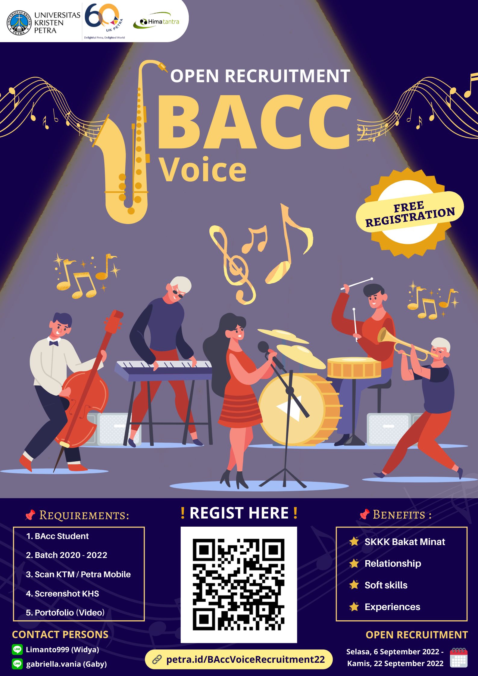 BAcc Voice merupakan salah satu komunitas di Jurusan Business Accounting UK Petra yang bertujuan untuk mencurahkan bakat dan talenta mahasiswa BAcc dalam bidang musik. BAcc Voice kerap kali eksis di sebagian besar acara-acara yang diselenggarakan oleh HIMATANTRA. Untuk info lebih lengkap silahkan dilihat di petra.id/BAccVoiceRecruitment2022