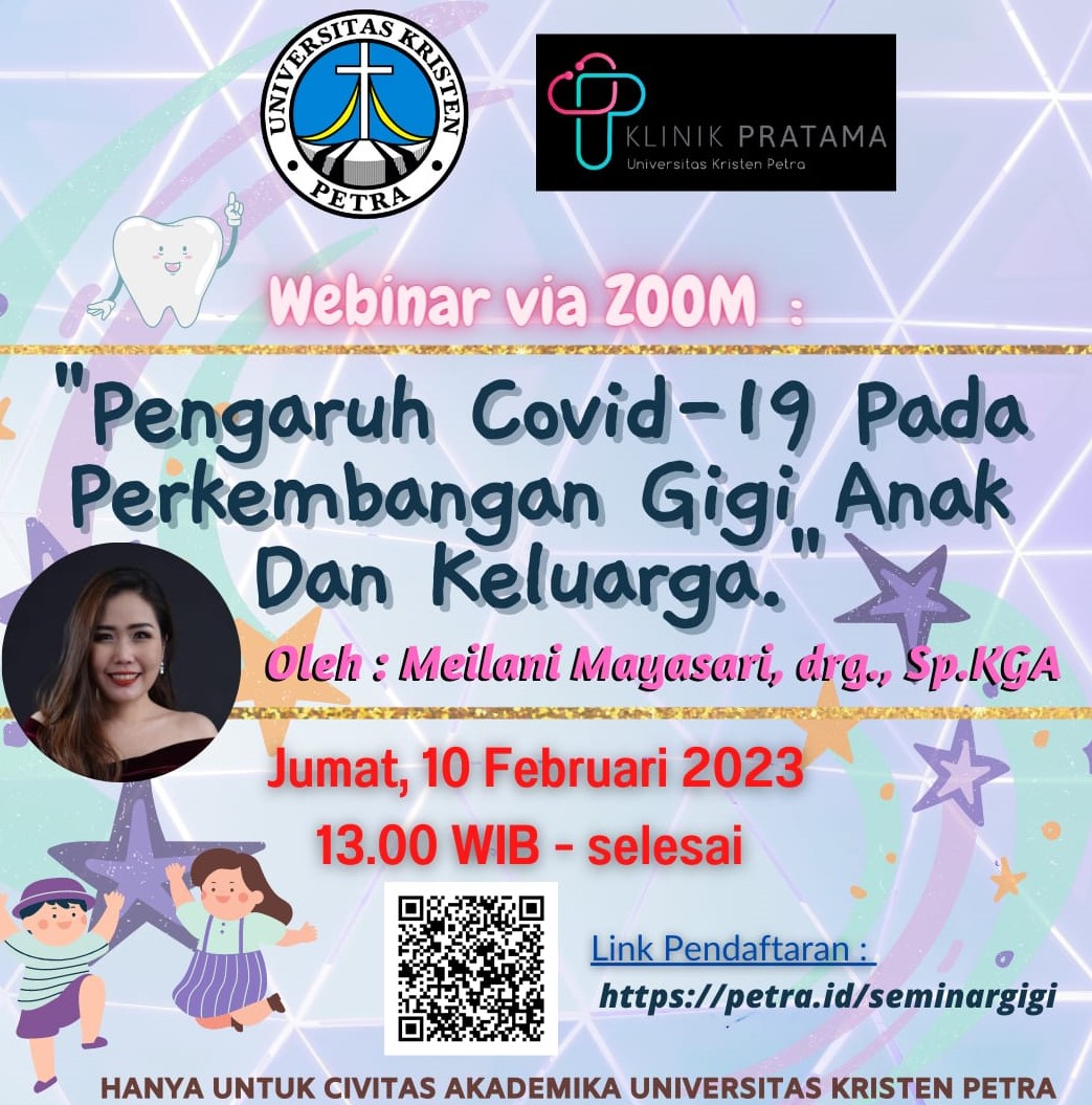 Unit Poliklinik Universitas Kristen Petra Surabaya, pada tanggal 10 Februari 2023 jam 13.00, mengadakan acara webinar Pengaruh Covid-19 pada perkembangan gigi anak dan keluarga. Dengan narasumber Meilani Mayasari, drg., Sp.KGA,