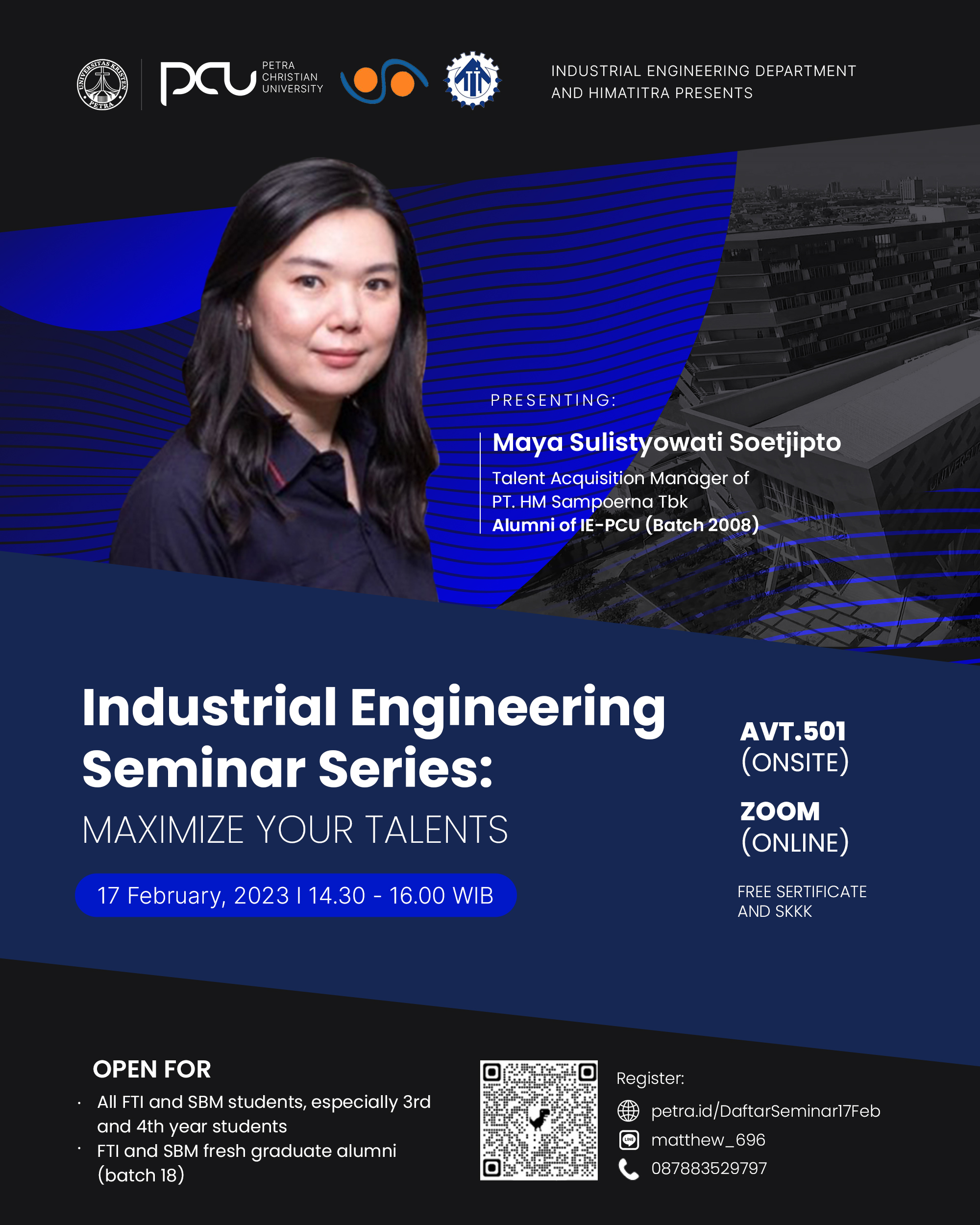Seminar rutin yang diadakan oleh jurusan Teknik Industri untuk menjembatani hubungan dengan pihak rekanan (industri). Seminar yang akan diselenggarakan akan diisi oleh salah satu alumni Tehnik Industri yang berpengalaman di bidang HR diperusahaan multinasional. Beliau akan membahas tentang bagaimana mahasiwa dan alumni untuk maximize their talents sebelum dan saat masuk dalam dunia pekerjaan nantinya.