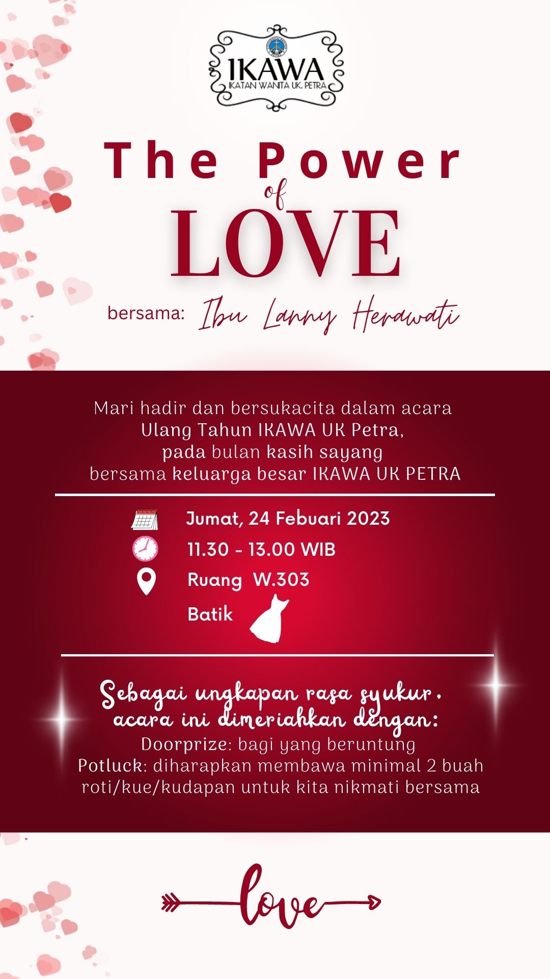 Pertemuan ikatan wanita (IKAWA) UK Petra Surabaya, kembali diadakan pada tanggal 24 Februari 2023 jam 11.30 - 13.00 WIB, bertempat di ruang W.303 dengan dresscode batik. Pada pertemuan ini mengangkat tema the Power of Love dengan narasumber ibu Lanny Herawati.