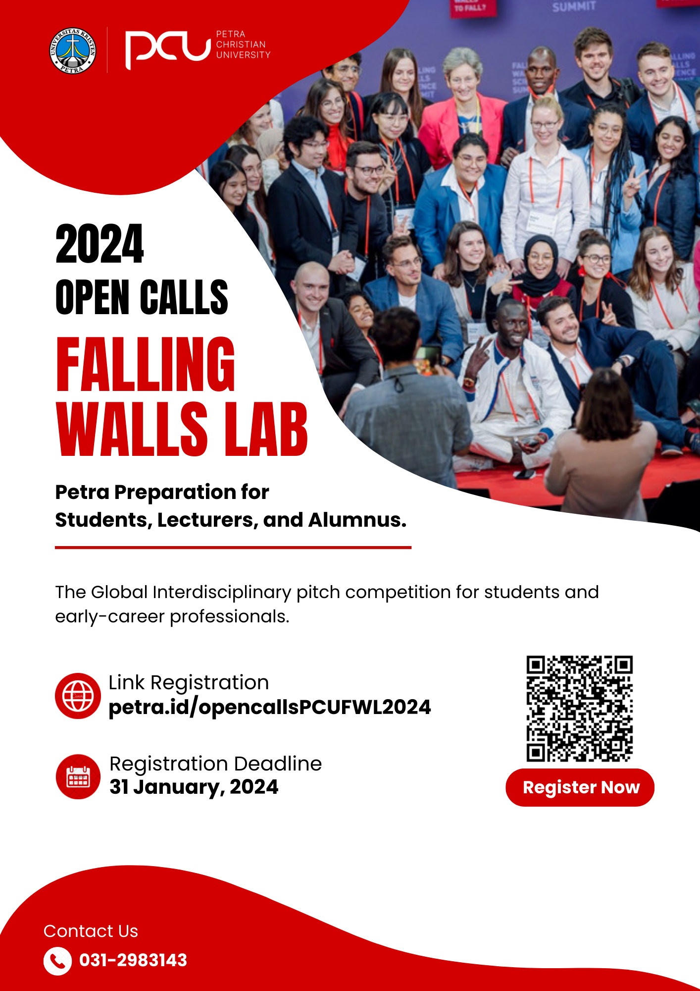 Open Calls Falling Walls Lab 2024 persiapan bagi Petra untuk mahasiswa, dosen, dan alumni. Falling Walls Lab adalah kompetisi penggagas ide inovasi interdisipliner global untuk mahasiswa dan profesional yang sedang dalam masa karir. Untuk deadline pendaftaran tanggal 31 Januari 2024.