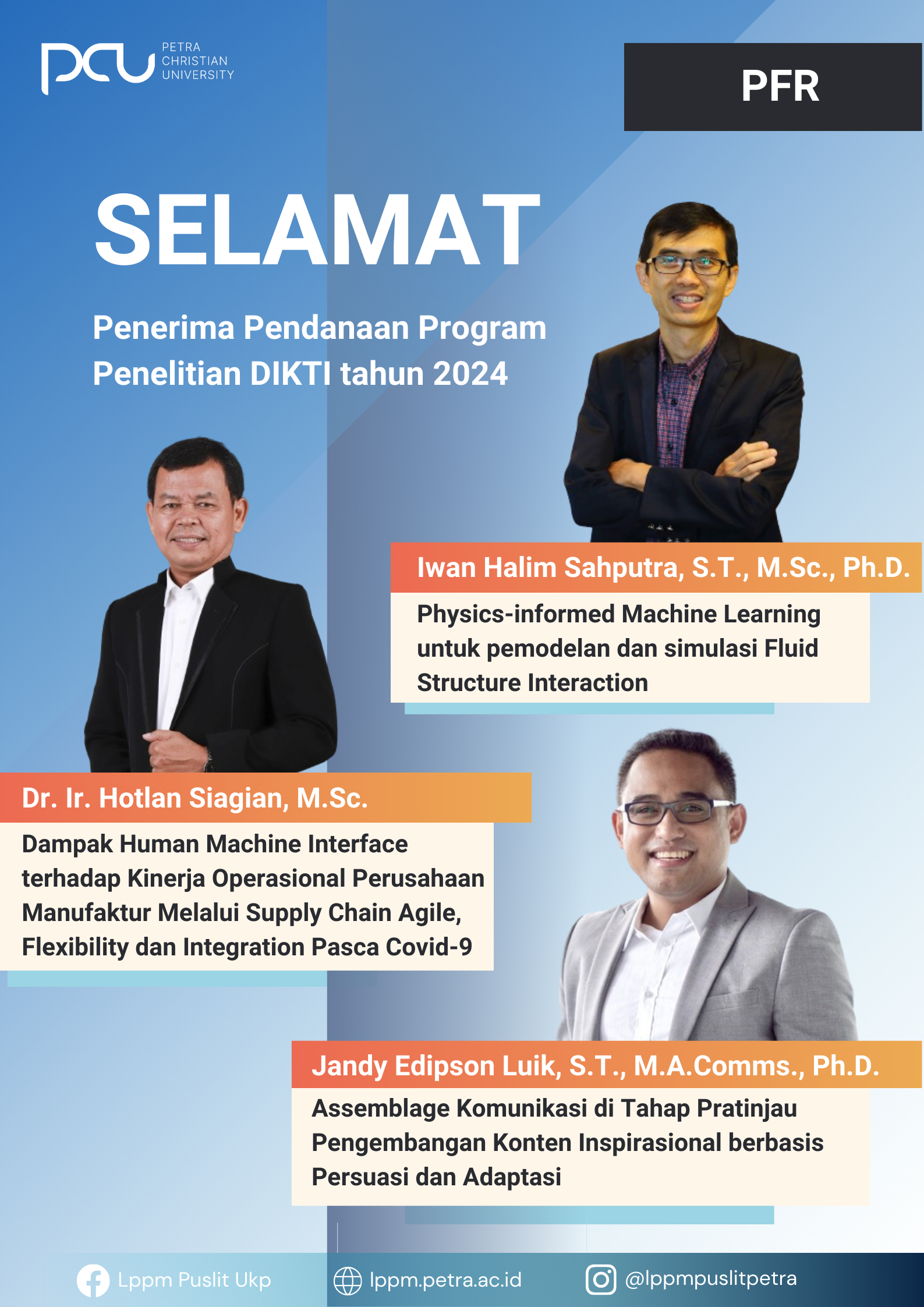 Selamat kepada Penerima Pendanaan P2M DIKTI tahun anggaran 2024. Yang diterima oleh Iwan Halim Sahputra, Ph.D., dan Dr. Hotlan Siagian, M.Sc., dan Jandy Edipson Luik, Ph.D.