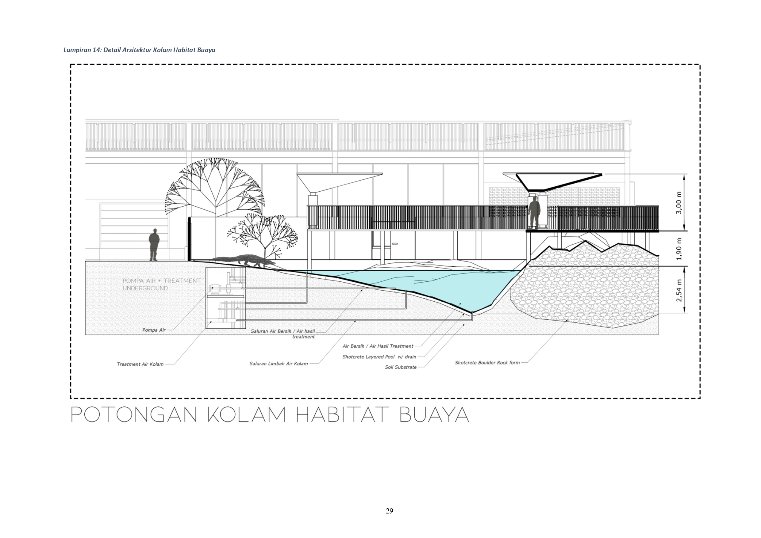 Taman Buaya Indonesia Jaya merupakan sebuah objek wisata dan konservasi buaya di Bekasi yang telah dibangun dari tahun 1990. Seiring dengan berjalannya waktu tanpa perkembangan, objek wisata dan konservasi buaya tersebut menjadi kurang layak dengan alasan menjadi tempat yang kurang memadai luasan keperluan sirkulasi buaya, serta desain habitat yang diperlukan oleh buaya. Dengan kurangnya dana dari inovasi kegiatan wisata dan kurang layaknya habitat konservasi buaya, dibutuhkan sebuah fasilitas taman konservasi dan museum buaya untuk menampung buaya serta juga meningkatkan turisme di daerah Bekasi yang berkurang. Fasilitas Museum dan Taman Konservasi Buaya di Bekasi merupakan desain perancangan untuk menampung dan mengonservasi buaya-buaya di sekitar Jawa Barat dengan memperhatikan perilaku kebutuhan sirkulasi dan perawatan buaya. Hal ini membantu proses perkembangbiakan dan pertumbuhan buaya agar dapat beradaptasi dalam lingkungan alam luar saat mereka dilepas untuk mengatasi ancaman jumlah buaya yang punah di Indonesia. Melalui pendekatan pada perilaku ini, diharapkan agar Fasilitas Museum dan Taman Konservasi Buaya tidak hanya memberikan solusi untuk mengatasi ancaman punah pada buaya tetapi juga memberikan wawasan kepada masyarakat sekitar melalui edukasi wisata yang immersive ntuk menciptakan kesadaran kepada masyarakat bahwa alam di Indonesia perlu diperhatikan.