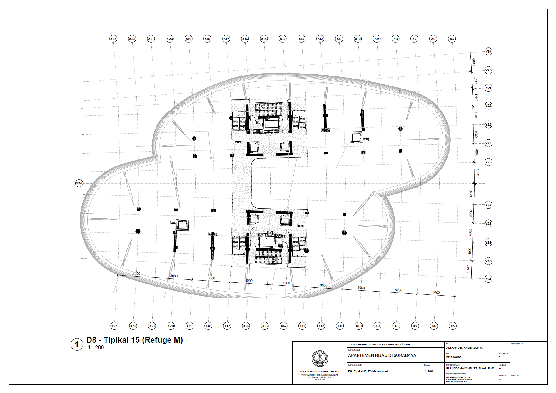 Kota Surabaya merupakan pusat perekonomian regional yang mengalami pertumbuhan populasi dan ekonomi setiap tahunnya. Meskipun telah bertumbuh meluas, Surabaya Pusat tetap merupakan salah satu pusat kegiatan terpenting di Kota Surabaya; hal ini ditunjukkan oleh kehadiran pengembangan-pengembangan baru di Surabaya Pusat. Namun, Surabaya Pusat sedang menghadapi tantangan tersembunyi, yakni kenaikan suhu area urban yang disebabkan oleh konstruksi serta minimnya ruang hijau terbuka. Fenomena yang diberi nama efek Urban Heat Island (UHI) ini semakin diperparah dengan pertumbuhan kota yang menimbulkan banyak pengembangan baru; menciptakan sebuah lingkaran umpan balik positif yang semakin memperparah efek UHI di Surabaya Pusat. Pengembangan-pengembangan baru sebaiknya mampu merespons pertumbuhan kota, namun dalam waktu yang sama, sekaligus merespons UHI. Proyek ini menawarkan sebuah pengembangan mixed-use berbasis hunian yang mengintegrasikan alam (cahaya, udara, vista, air, vegetasi) melalui pendekatan Nature-based Placemaking (NBP). Analisis pergerakan udara (CFD) mendasari orientasi dan bentuk bangunan untuk memperoleh penghawaan yang optimal. Dua buah tower hunian dengan segala fasilitas penunjangnya dihubungkan dengan podium komersil. Celah yang menerus secara diagonal pada setiap tower mempermudah laluan vista, cahaya dan udara; dan taman-taman gantung menyediakan ruang-ruang bagi penghijauan vertikal dan aktivitas luar ruangan di seluruh bangunan. Desain ini menciptakan sebuah kompleks baru yang merespons pertumbuhan kota sekaligus permasalahan iklim.