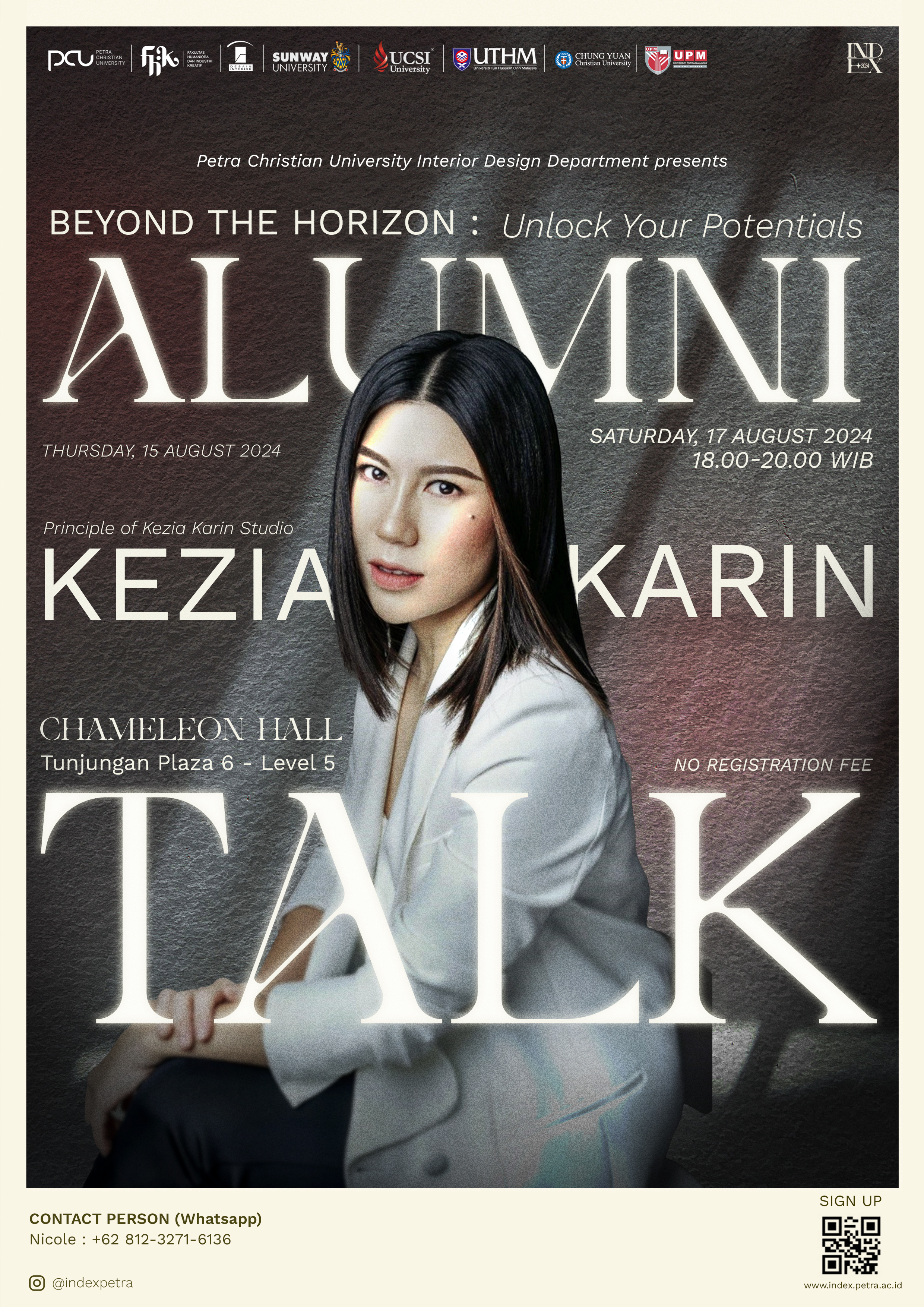 Dalam Rangka Memeriahkan acara INDEX 2024, diadakan acara alumni talk beyond to horizon unlock your potentials. Acara workshop ini diadakan pada Sabtu 17 Agustus 2024 di Chameleon Hall TP 6 lantai 5. Dengan narasumber Kezia Karin.