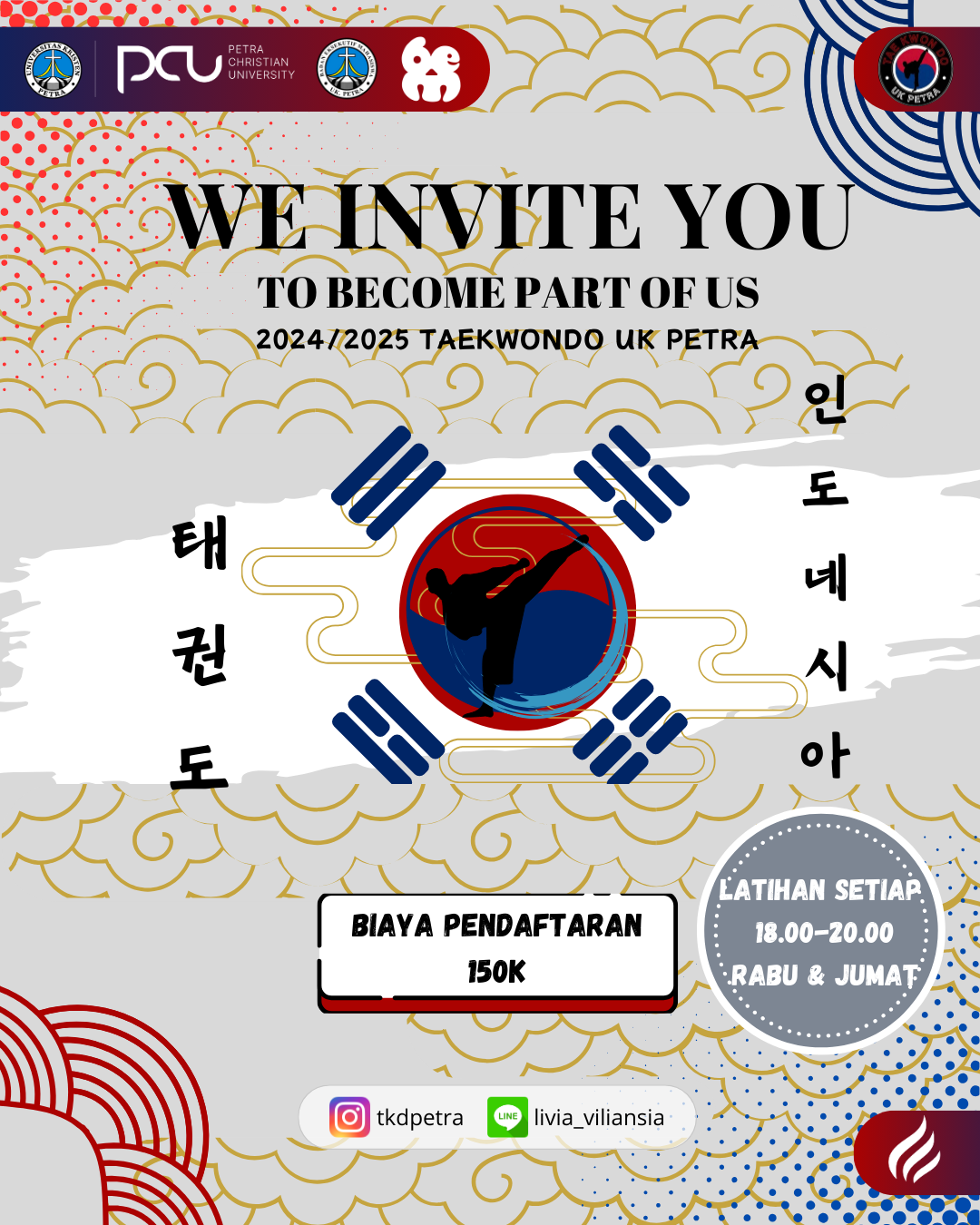Pendaftaran UKM Taekwondo tahun 2023/2024 telah dibuka. Dengan biaya pendaftaran 150.000.