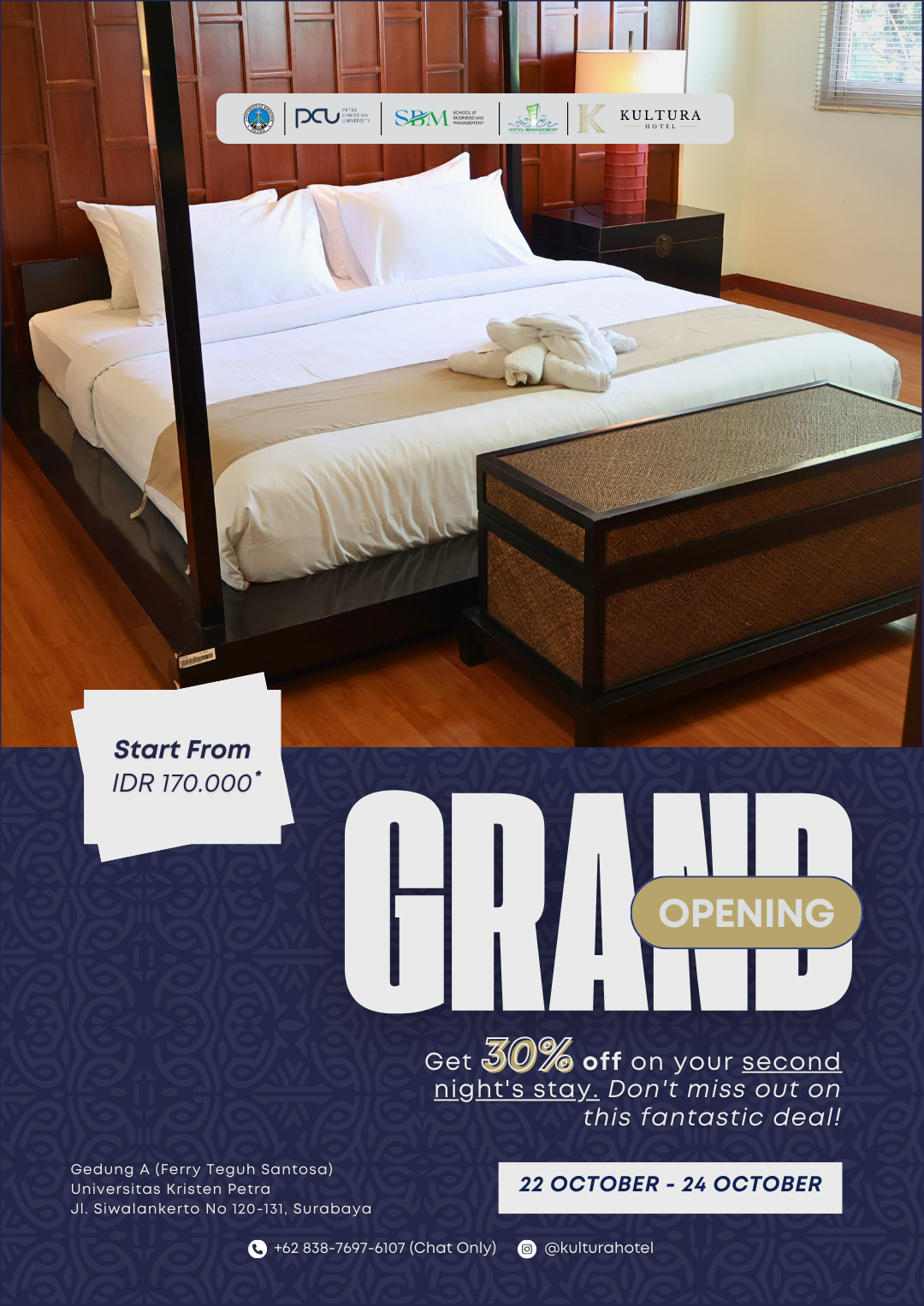 Join us for the Grand Opening of Kultura Hotel from October 22 to October 24! Enjoy a luxurious stay in one of our comfortable rooms, with prices starting from just IDR 170,000 per night. As a special offer, you'll get 30% off your second night's stay! Don't miss out on this fantastic deal and make your reservation now for an unforgettable experience.