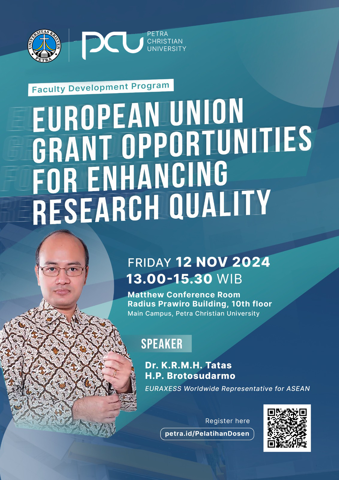 Pada Jumat 12 November 2024 jam 13.00 - 15.30 WIB bertempat di Matthew Conference Room Uniersitas Kristen Petra Surabaya, Pimpinan UK Petra mengadakan seminar untuk dosen-dosen dilingkungan UK Petra dengan topik "European union grant opportunities for enhancing research quality". Sebagai narasumber pada seminar ini Dr. K.R.M.H. Tatas H.P. Brotosudarmo.
