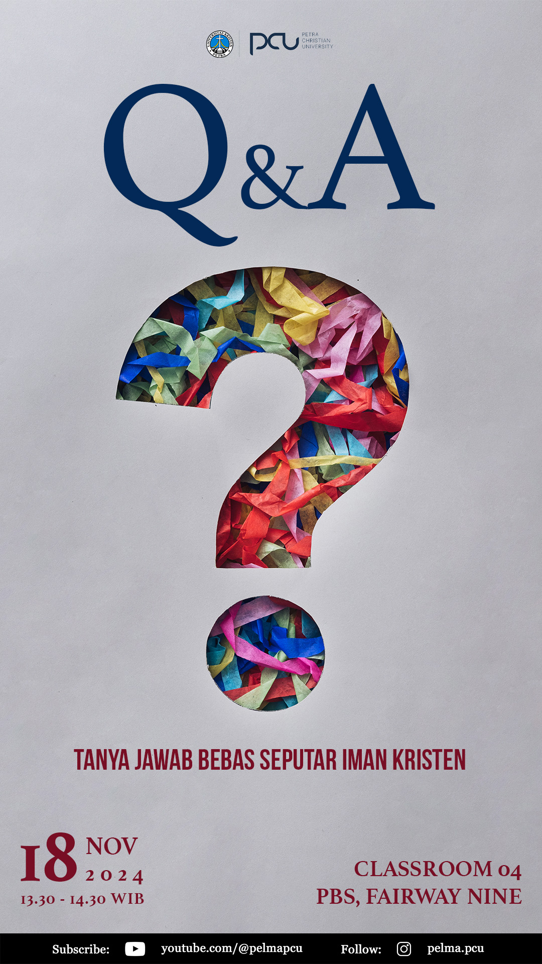 Pada 18 November 2024 jam 13.30 - 14.30 WIB, bertempat di Petra Business School classroom 04 Fairway Nine Surabaya, Pusat Kerohanian UK Petra mengadakan acara Sesi tanya jawab bebas seputar iman Kristen.