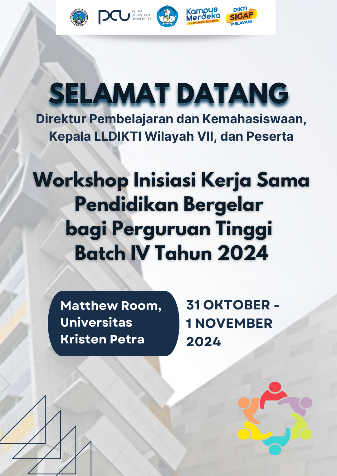 Workshop Inisiasi Kerja Sama Pendidikan Bergelar bagi Perguruan Tinggi Batch IV Tahun 2024, dilaksanakan pada 31 Oktober - 01 November 2024, bertempat di ruang Matthew Universitas Kristen Petra Surabaya.