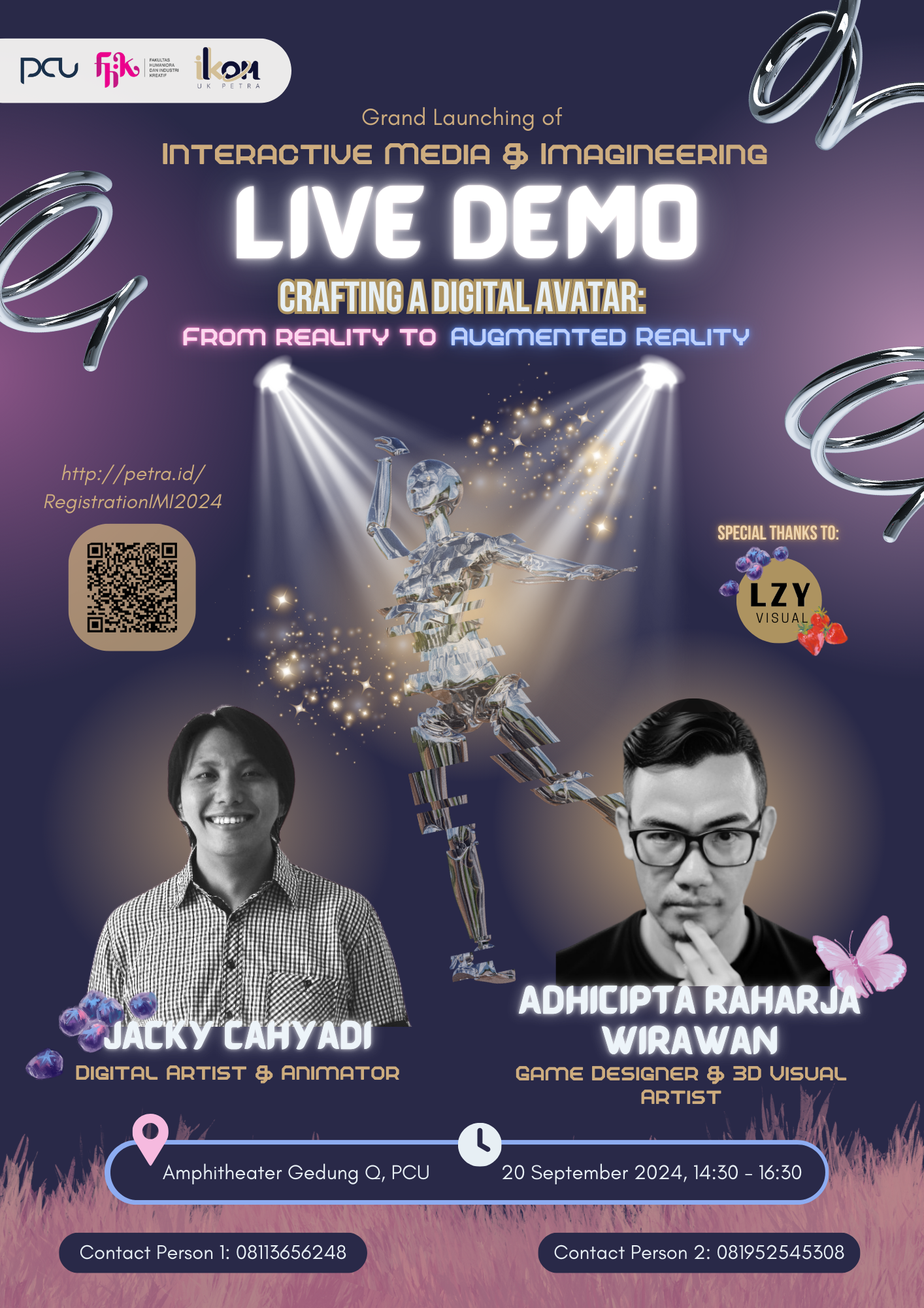 Dalam rangka pembukaan program interactive media and imagineering, Program Studi Ilmu Komunikai UK Petra menyelenggarakan acara live demo crafting a digital avatar. Acara ini diselenggarakan pada 20 September 2024, bertempat di Amphitheater Gedung Q. Dengan narasumber Jacky Cahyadi dan Adhicipta Raharja Wiryawan.