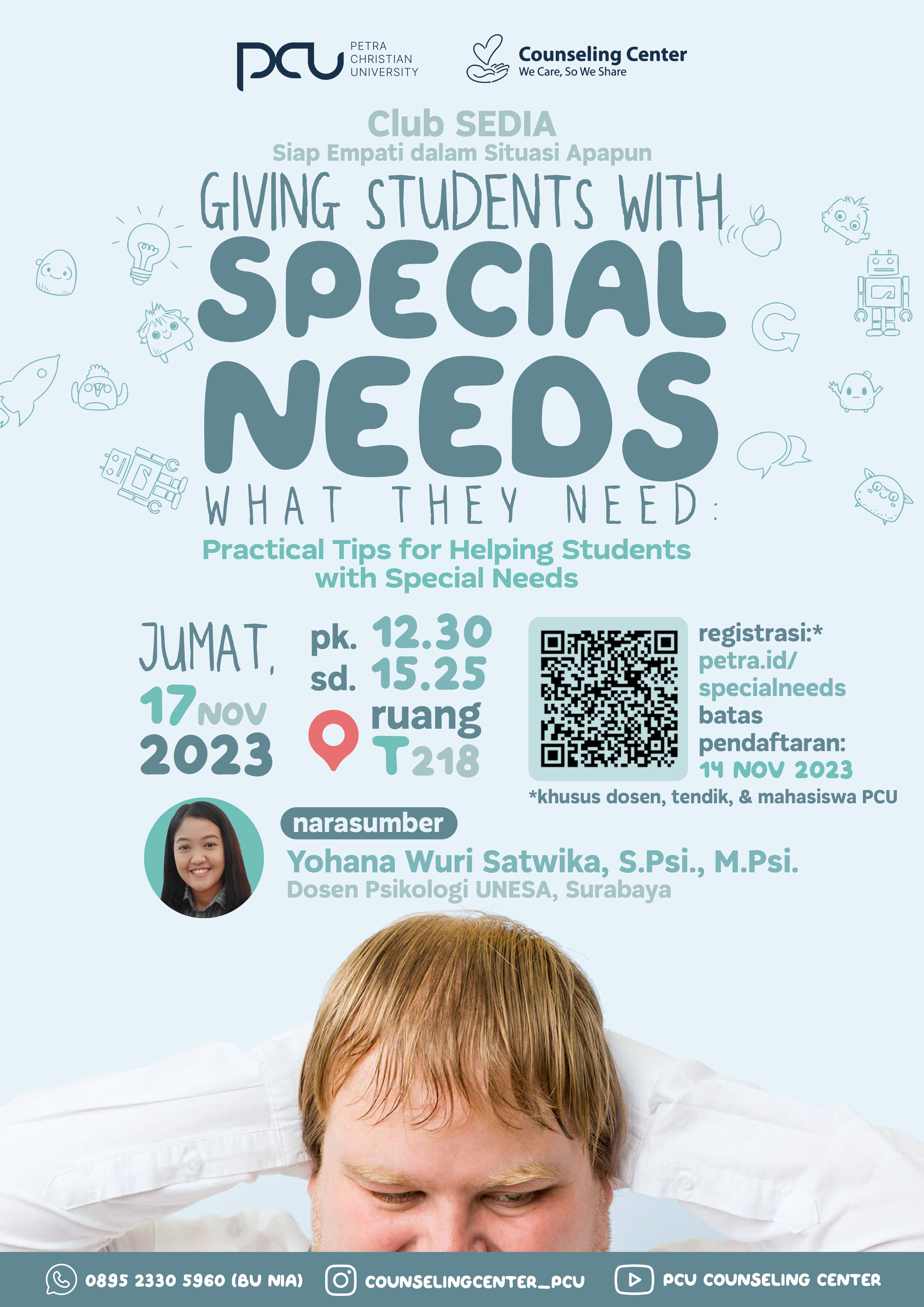 Pusat Konseling dan Pengembangan Pribadi Universitas Kristen Petra Surabaya pada tanggal 17 November 2023 mengadakan workshop dengan tema "Giving students with special needs what they need". Dengan narasumber Yohana Wuri Satwika, M.Psi. bertempat di gedung T.218.