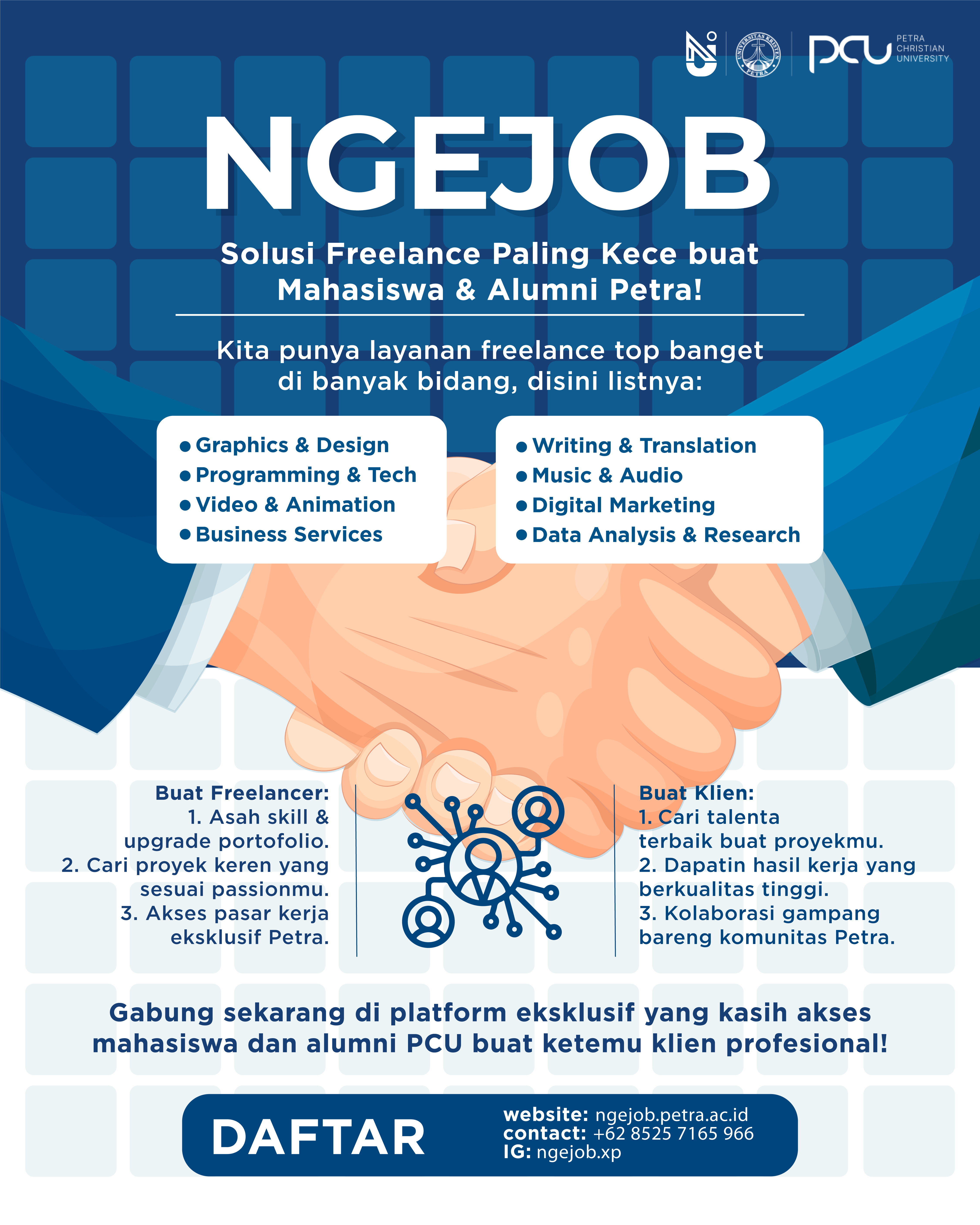 Kami super excited memperkenalkan "NGEJOB," platform freelance eksklusif yang dibuat spesial untuk mahasiswa dan alumni Petra! 🎉 NGEJOB hadir untuk memberikan solusi terbaik bagi kalian yang ingin.