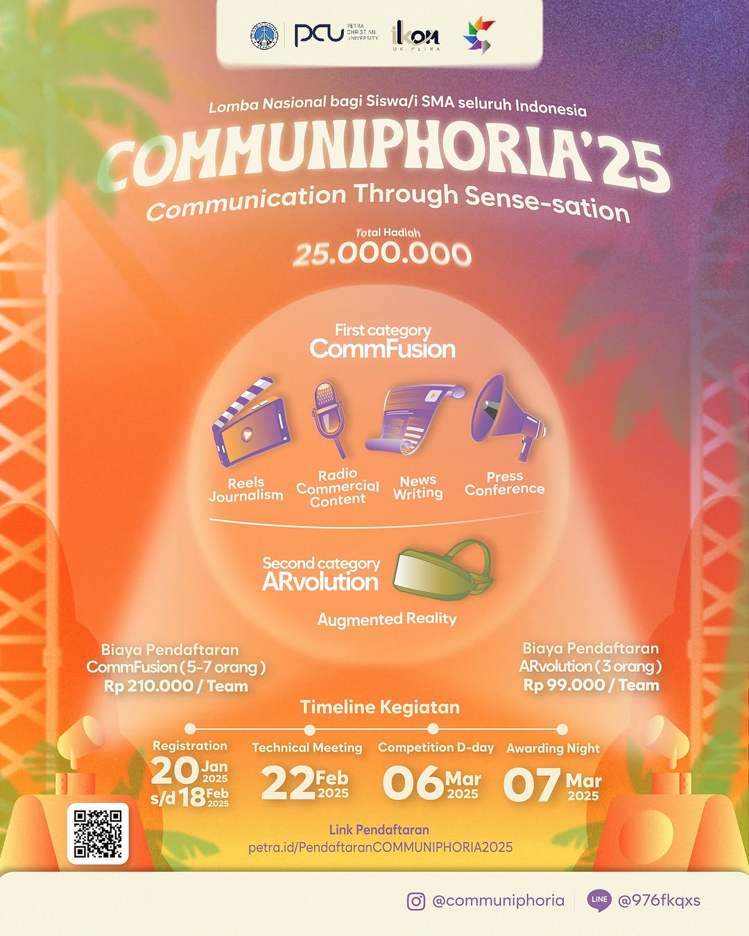 Program Studi Ilmu Komunikasi UK Petra Surabaya mengadakan lomba Communication Euphoria 2025, banyak ragam lomba yang akan diselenggarakan. Untuk info lebih lanjut bisa dilihat petra.id/PendaftaranCommuniphoria2025
