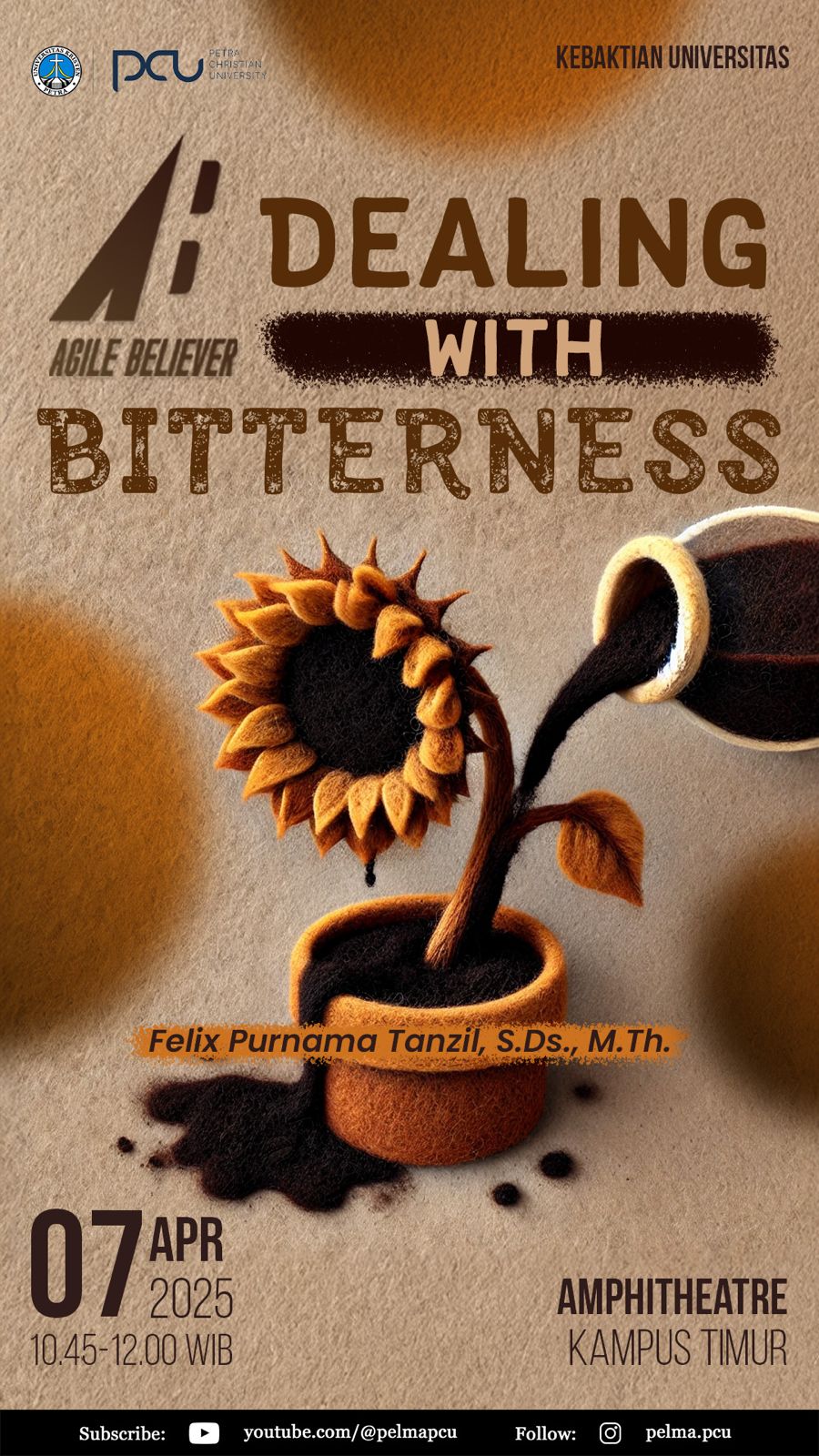 Universitas Kristen Petra mengundang seluruh civitas pada Kebaktian Universitas. Kebaktian yang diselenggarakan pada Senin, 07 April 2025 jam 10.45 - 12.00 WIB bertempat di Amphitheatre gedung Q, Pada Kebaktian ini akan diangkat tema agile believer - dealing with bitternes. Dengan Pengkhotbah Felix Purnama Tanzil, M.Th.