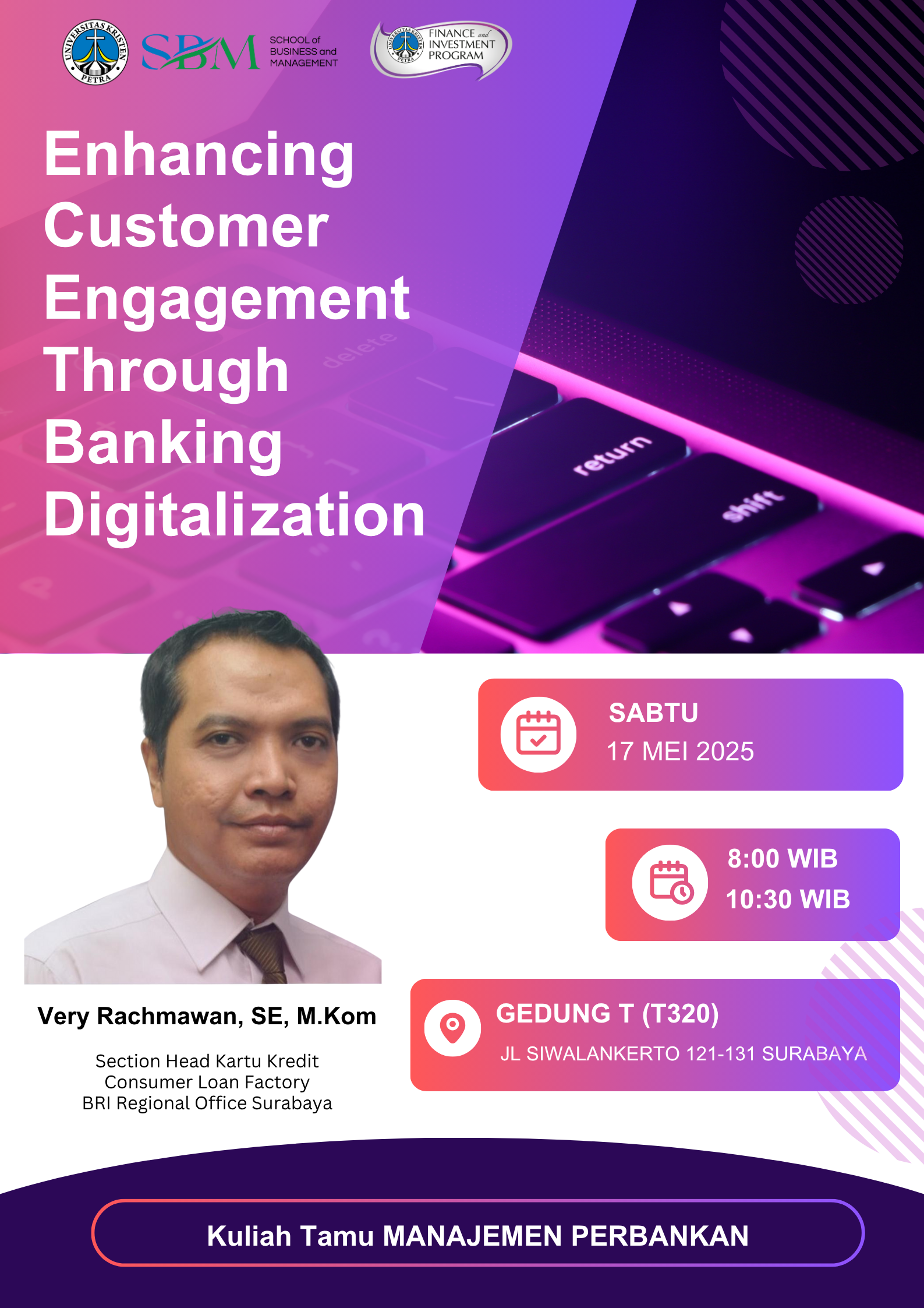 Program Manajemen Keuangan Universitas Kristen Petra Surabaya menyelenggarakan Kuliah Tamu mata kuliah manajemen perbankan pada 17 Mei 2025 jam 08.00 - 10.30 WIB bertempat di gedung T.320. dengan narasumber Very Rachmawan, SE., M.Kom. Topik yang diangkat ialah "Enhancing customer engagement through banking digitalization."