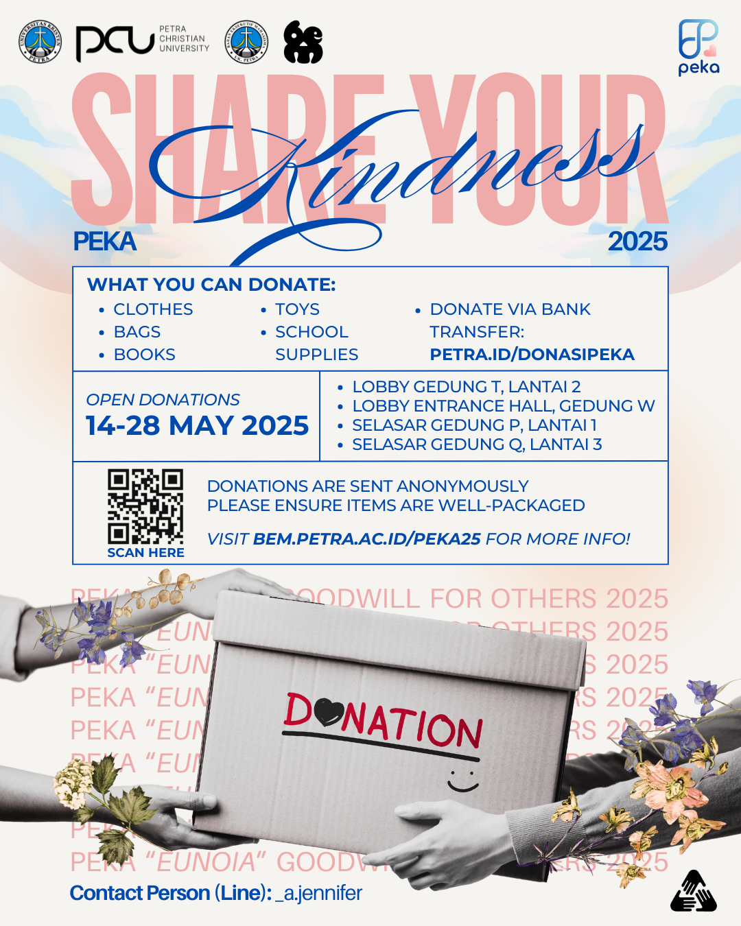 PEKA 2025 merupakan kegiatan pengabdian masyarakat yang berfokus pada pengumpulan donasi berupa pakaian, buku, alat tulis, mainan, tas, dan dana. Seluruh donasi tersebut akan disalurkan ke 7 panti asuhan di Surabaya, disertai dengan acara fellowship. Pengumpulan donasi dibuka pada tanggal 14-28 Mei 2025.