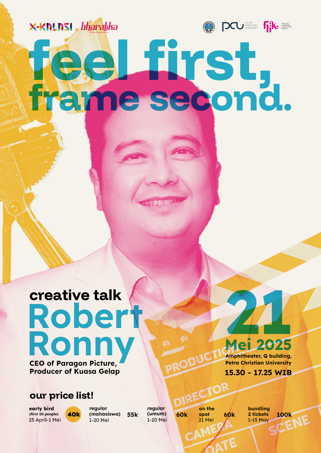 "Producing World-class Movie Starts from the Heart" merupakan judul dari acara Creative Talk dari Bharatika yang membahas produksi film bersama CEO sekaligus produser dari Paragon Pictures, Robert Ronny. Acara talkshow ini diselenggarakan pada 21 Mei 2025 jam 15.30 - 17.30 WIB. Bertempat di Amphitheater gedung Q.