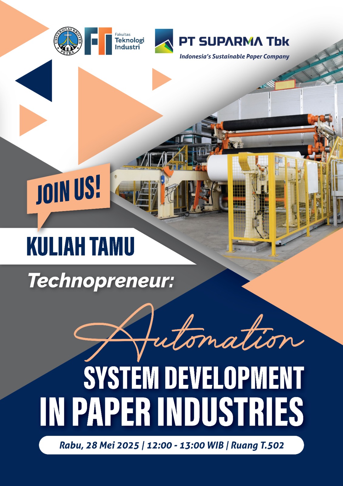 Fakultas Teknologi Industri Universitas Kristen Petra Surabaya pada Rabu, 28 Mei 2025 mengadakan kuliah tamu. Kuliah tamu mengangkat tema "Automation system development in paper industries". Pertemuan ini membahas tentang perkembangan sistem otomasi di dunia industri kertas.