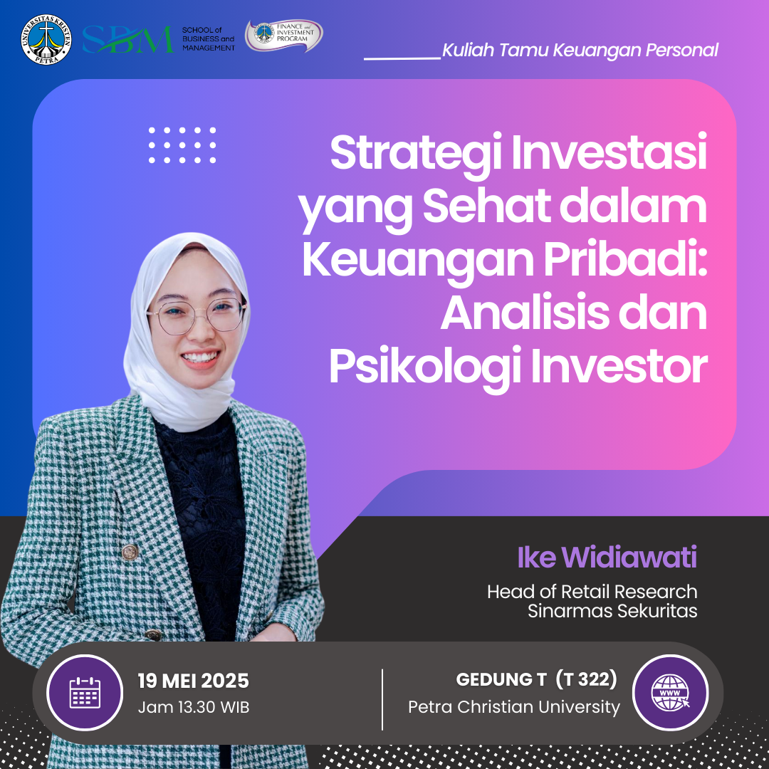 Pada tanggal 19 Mei 2025 jam 13.30 WIB bertempat di T.322 Program Manajemen Keuangan UK Petra mengdakan kuliah tamu dengan topik "Strategi investasi yang sehat dalam keuangan pribadi: analisis dan psikologi investor." Dengan narasumber Ike Widiawati dari Sinarmas Sekuritas.